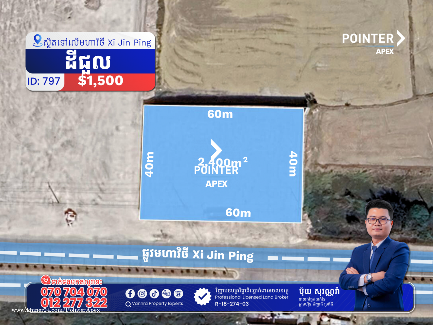 ដីជួលនៅលើផ្លូវមហាវិថី Xi Jin Ping សម្រាប់ជួល:$1,500 ទំហំដី:60m x 40m (2,400m2) 🔐លេខកូដអចលនវត្ថុ៖ 797 📌 ស្ថិតនៅលើផ្លូវមហាវិថី Xi Jin Ping ឃុំព្រះពុទ្ធ ស្រុកកណ្តាលស្ទឹង ខេត្តកណ្តាល ——————————— ទាក់ទងមកឥលូវនេះ៖ Call: 070704xxxClick To Call / 012277xxxClick To Call Telegram: https://t.me/vannraaa 微信号: vannra-experts - Channel: https://t.me/vannrapropertyexperts - Tiktok: https://www.tiktok.com/@vannra_property_experts - Facebook: https://www.facebook.com/vannra.phnompenh.property/