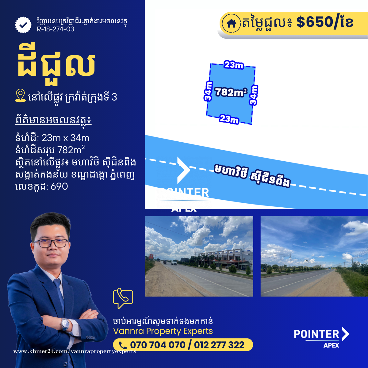 ដីសម្រាប់ជួលនៅលើមហាវិថី Xi Jinping សម្រាប់ជួល:$650 ទំហំដី: 23m x 34m (782m2) 🔐លេខកូដអចលនវត្ថុ៖ 690 📌 លើផ្លូវជាតិក្រវ៉ាត់ក្រុងទី3 សង្កាត់ គងនយ ខណ្ឌ ដង្កោ ភ្នំពេញ ——————————— ទាក់ទងមកឥលូវនេះ៖ Call: 070704xxxClick To Call / 012277xxxClick To Call Telegram: https://t.me/vannraaa 微信号: vannra-experts - Channel: https://t.me/vannrapropertyexperts - Tiktok: https://www.tiktok.com/@vannra_property_experts - Facebook: https://www.facebook.com/vannra.phnompenh.property/