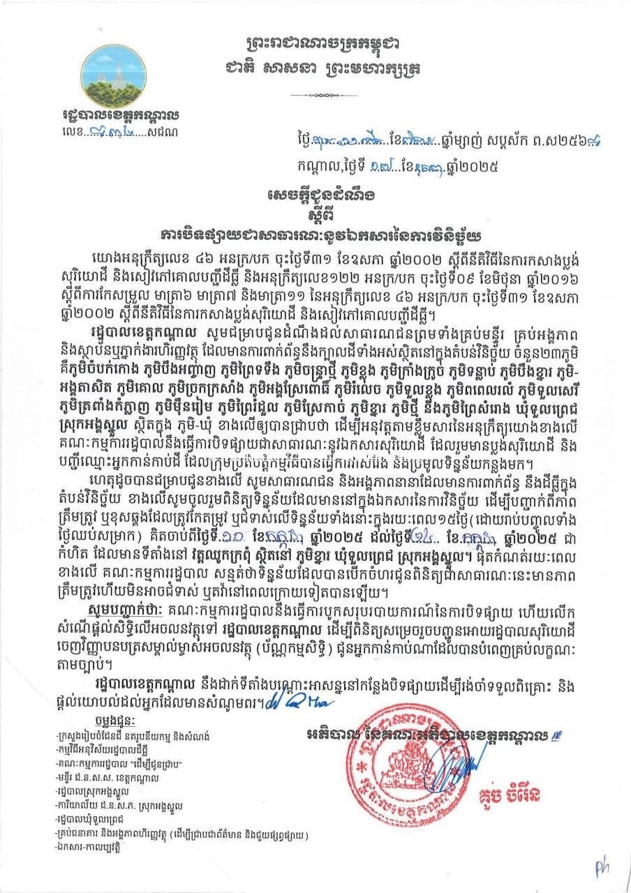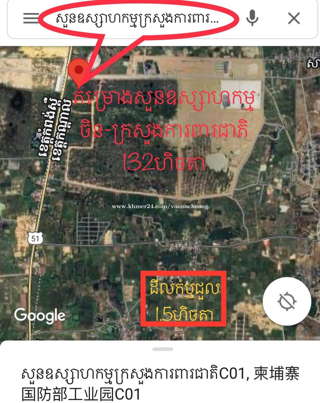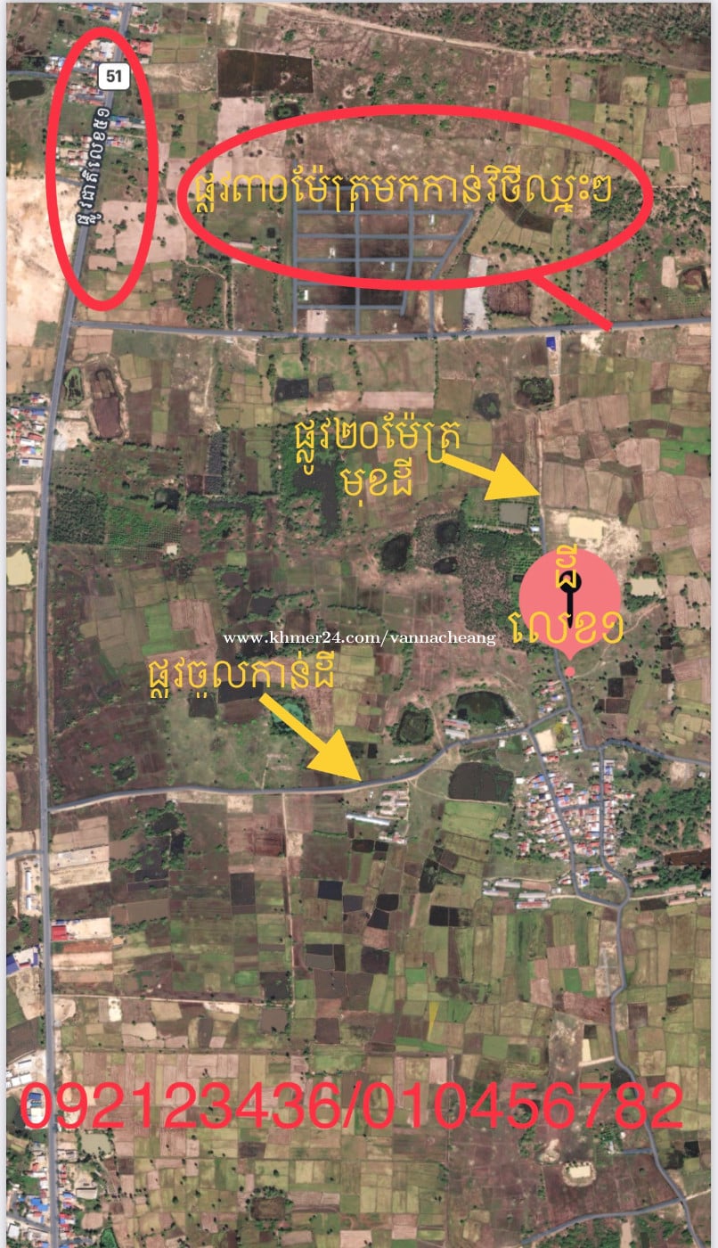 ដីម្ចាស់ផ្ទាល់ (ក្បែរសួនឧស្សាហ៍កម្មចិន និងក្រសួងការពារជាតិ C-01 - ដីចុះពីផ្លូវ51ប្រហែល 1000m ខាងកើត - ក្បាលដី27ម៉ែត្រ ជាប់ផ្លូវរដ្ឋគម្រោង20m ក្បែរផ្លូវចូលតាមវត្តភ្នៀតមកកាន់រាជធានី - នឹងមានគម្រោងធំៗក្បែរហ្នឹង ទិញទុកទៅមិនខុសទេ - ដីទំហំ 15,814 ម៉ែត្រការ៉េ(អាចពុះឡូរ៍ ឬបុរីបាន ធ្វើរោងចក្រ ឃ្លាំង ......) - នៅភូមិចន្រ្ទាថ្មី ឃុំទួលព្រេជ ស្រុកអង្គស្នួល ខេត្តកណ្តាល - មានទឹកភ្លើង ស្រួលរកកម្មករ - កំពុងធ្វើប្លង់រឹងជាប្រព័ន្ធ - តម្លៃ: លក់ 30$ - ជួល: 400រៀល/ការ៉េ/ខែ ទីតាំងដី https://goo.gl/maps/5N1FBNaYWRsnRgWF7 ទីតាំងសួនឧស្សាហ៍កម្ម: https://business-cambodia.com/articles/industrial-park-in-kandal-province