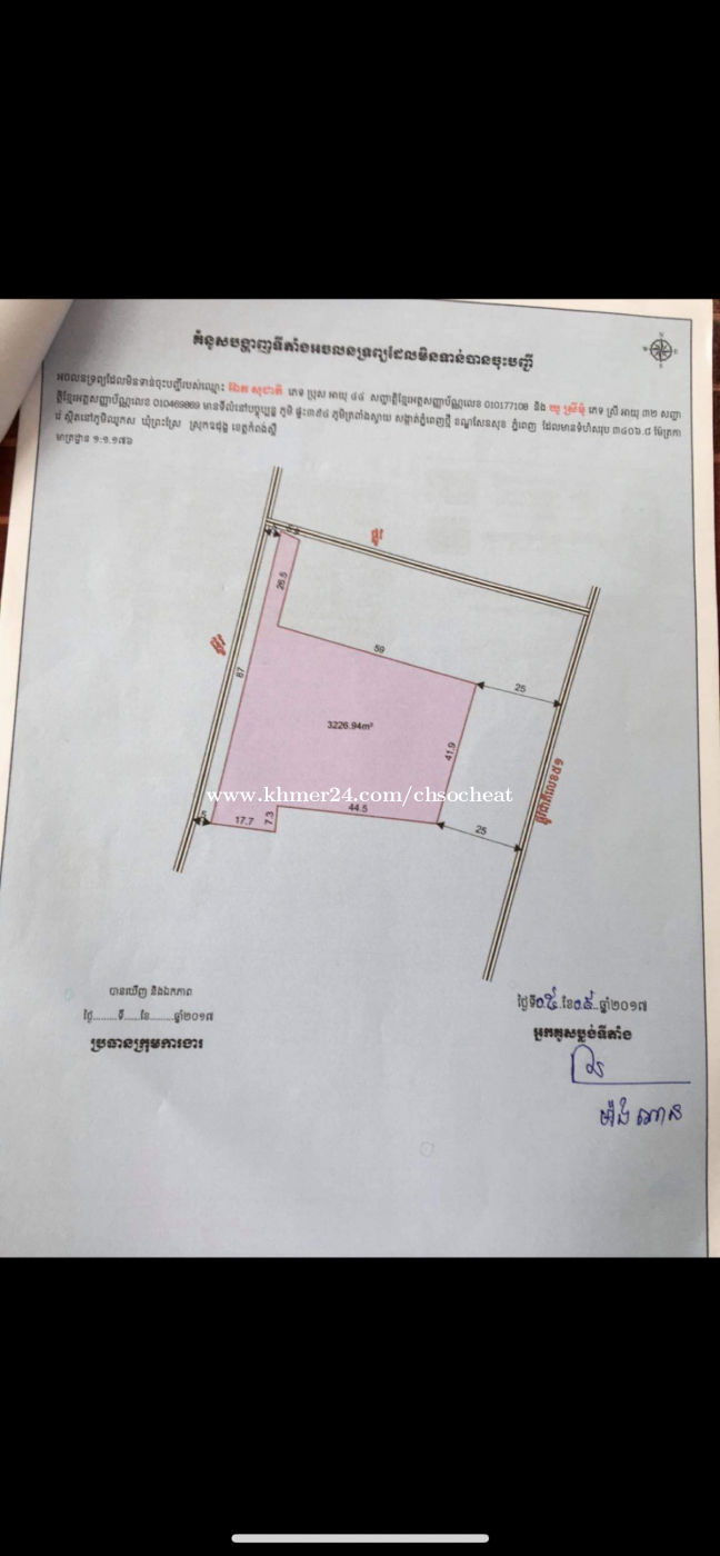 ទីតាំងល្អជាប់ផ្លូវជាតិលេខ៥១ ស្ថិតនៅក្នុងភូមិត្រពាំងឈូក ឃុំព្រះស្រែ ក្រុងឧតុង្គម៉ែជ័យ ខេត្តកំពង់ស្ពឺ។ ដីរាងអក្សរT(តេ)ជាប់ផ្លូវបីជ្រុងគឺផ្លូវជាតិលេខ៥១ និងផ្លូវលំទំហំ១០ម៉េត្រ២ទៀត ល្អសំរាប់អាជីវកម្ម។ ទំនាក់ទំនងមកលេខទូរសព្ទ: 012650xxxClick To Call, 012822xxxClick To Call (មានតេឡេក្រាម)។