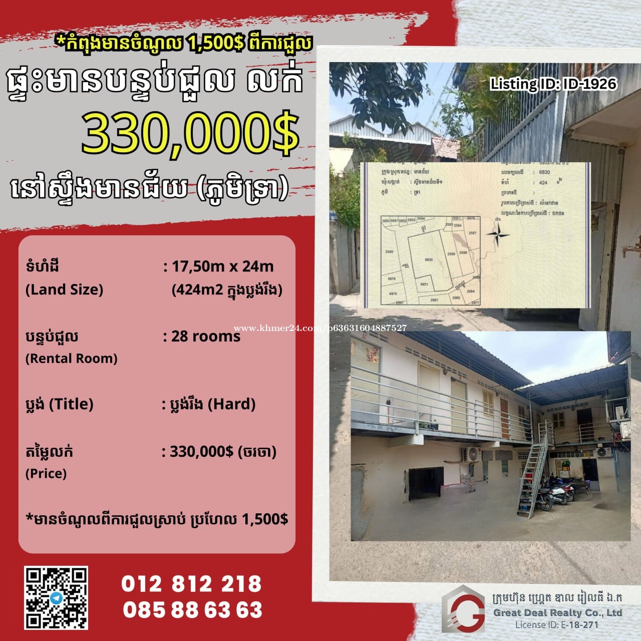ដីនិងផ្ទះលក់បន្ទាន់ - ស្ទឹងមានជ័យ (ភូមិទ្រា) តម្លៃ: $330,000 (ចរចា) ទំហំដី: 17.5m x 24m ប្លង់រឹង: 424m2 ផ្ទះមាន 28បន្ទប់ជួល ចំណូលបានប្រហែល $1,500/ខែ ☎️សម្រាប់ព័ត៌មានបន្ថែម៖ 012812xxxClick To Call/ 015812xxxClick To Call/ 087812xxxClick To Call