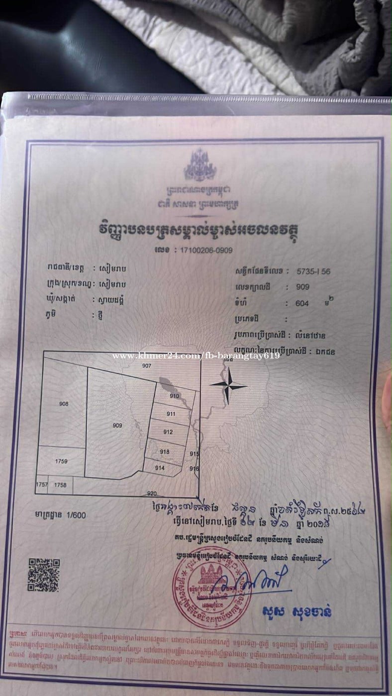ក្បាល 8*31 ក្បាលដី8ម៉ែត្របណ្ដោយ 31 រាជក្បាលដីខាងក្រោយ 12 ម៉ែត្រ។ផ្ទៃដីក្រឡា 300 4 ម៉ែត្រការ៉េ។ ត្រជាប្រភេទដីប្លង់រឹងមានរបងមួយជុំចាក់ដីហើយស្អាតលោកអ្នកអាចសង់ផ្ទះបានរស់នៅភ្លាមៗមានប្រជាពលរដ្ឋរស់នៅក្នុងភូមិច្រើន។កុះករទឹករាត់ភ្លើងរដ្ឋ។ ផ្លូវមិនទាល់ធ្លុះមុខធ្លុះក្រោយជាប់ជាមួយផ្លូវរាល់ 6 ម៉ែត្រ ជិះពី pub street មកដីចំណាយពេល 5 នាទី ជិះពីផ្សារក្រោមមកដីចំណាយពេលព2 នាទី