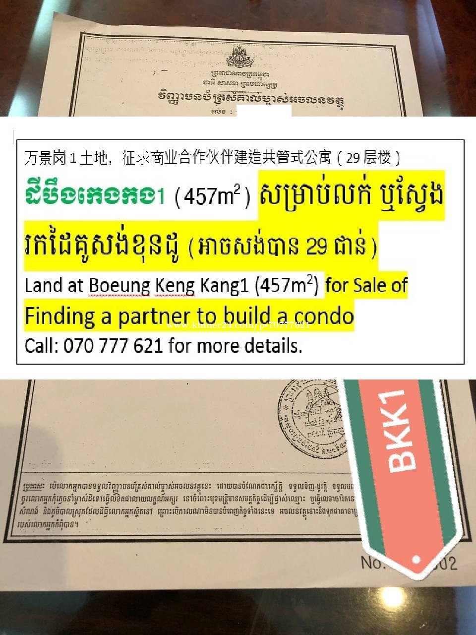 出售万景岗1土地,或征求商业合作伙伴建造共管式公寓(29层楼) 土地拥有者(土地亦可出售)诚意征求商业合作伙共同在万景岗1建造一栋公寓。面积为457 m2,可建29层楼高,有意者请致电070777xxxClick To Call查询详情及商议。谢谢。 Land Boeng Keng Kang 1, for Sale or Find a partner to build condo Want to sell or find a partner to build a condo on my land at Boeng Keng Kang 1, Khan Chamkarmorn. The size is 457 m2. Can build up to 29 floors. Call 070777xxxClick To Call for more info.