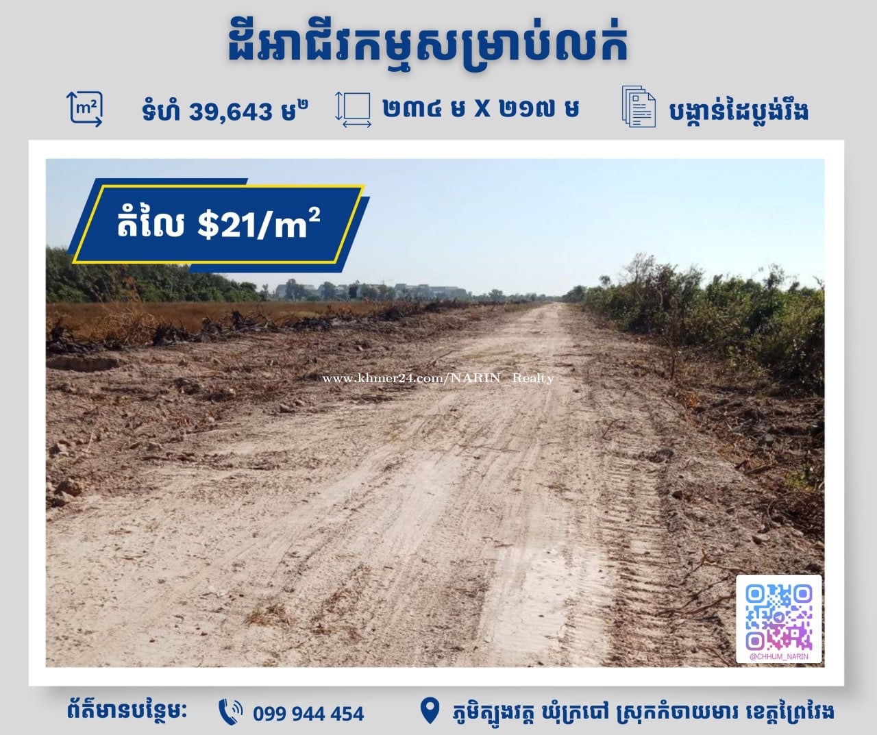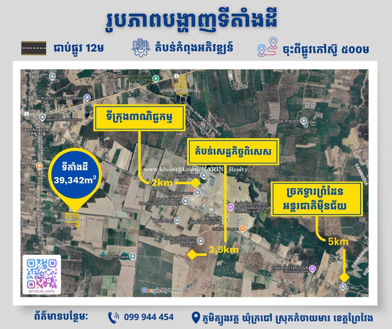 MT009 # ដីនៅម៉ឺនជ័យ សម្រាប់លក់ 🔸 ទំហំ 39,643ម២ (234មx217ម*) 💰 តំលៃ 21$/m2 🔸 បង្កាន់ដៃប្លង់រឹង 🔸 លើផ្លូវ១២ម កំពុងឈួសឆាយ 🔸 ចុះពីផ្លូវកៅស៊ូ ៥០០ម 📍ស្ថិតនៅ ភូមិត្បូងវត្ត ឃុំក្របៅ ស្រុកចំកំចាយមារ ខេត្តព្រៃវែង 🏝 MAP : https://maps.app.goo.gl/eyZTzZe5jFCu5r547?g_st=ipc