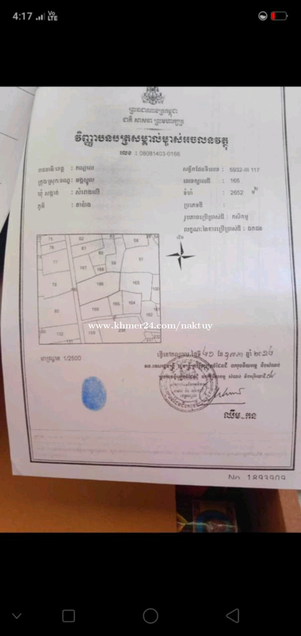 យើងខ្ញុំត្រូវការលក់ដីមួយកន្លែងដែលមានទីតាំង នៅសំរោងលើស្រុកអង្គស្នួលខេត្តកណ្ដាលតម្លៃត្រឹមតែ 19 ដុល្លារក្នុងមួយម៉ែត្រការ៉េ ជាប់នឹងផ្លូវ 6 ម៉ែត្របេតុង សូមអរគុណ