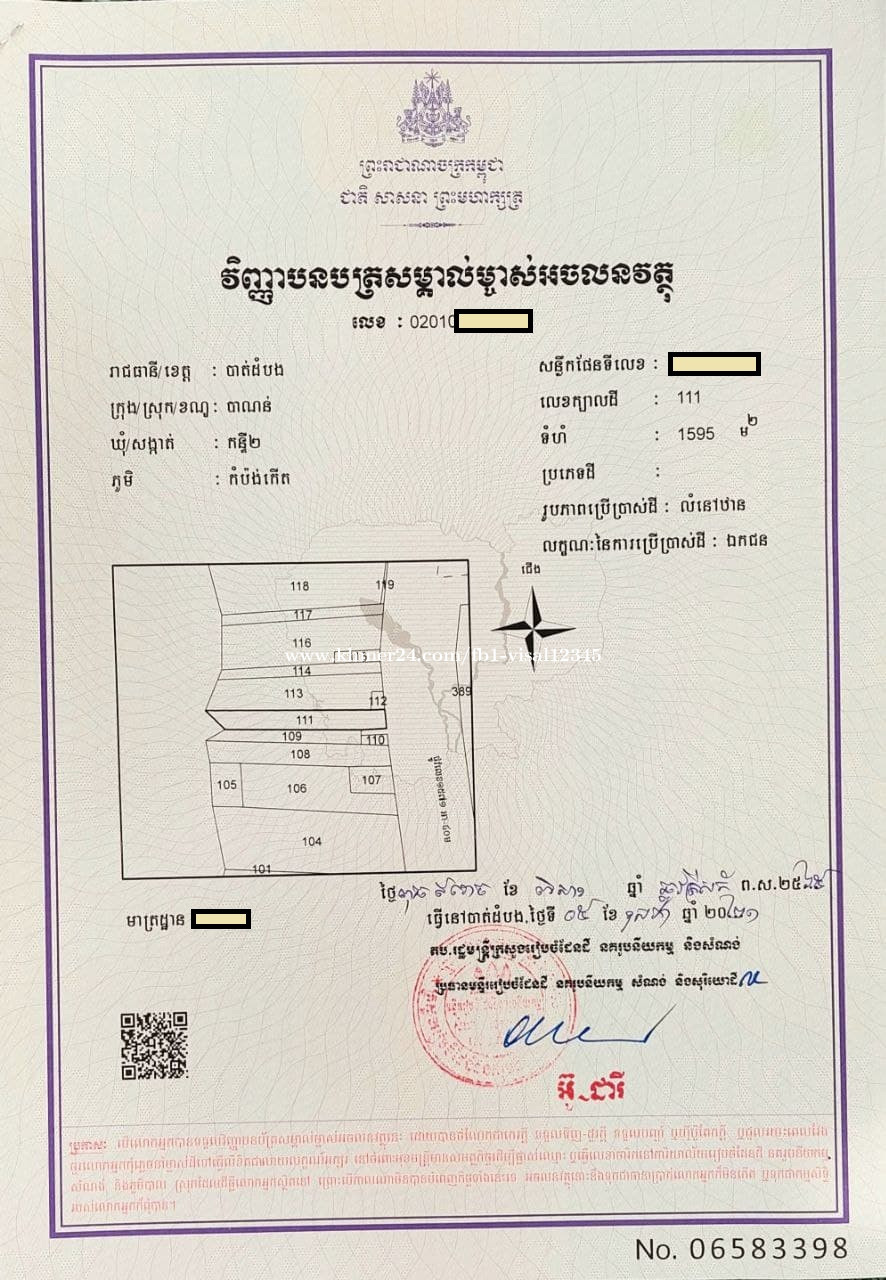 ដីលក់នៅមុខប្រាសាទបាណន់ខេត្តបាត់ដំបងតំបន់ទេសចរណ៍ត្រើយកើត៖ ទំហំដី 13ម * 122ម(កាត់ចំណីថ្នល់និងស្ទឹងរួច) លក្ខណៈពិសេស៖ o ក្បាលដីជាប់ថ្នល់កៅស៊ូ កន្ទុយដីជាប់ស្ទឹងសង្កែរ o នៅមុខដីជាតំបន់អភិវឌ្ឍន៍ទេសចរណ៍ គំរោងរដ្ឋសាង់សង់បារាយរណ៍(មើលក្នុងផែនទីកាន់តែច្បាស់Google Map) o ជិតប្រាសាទភ្នំបាណន់ និង ឡូរី (ប្រហែល១គីឡូម៉ែត) o ជាប្រភេទដីភូមិ ប្លង់រឹង o មានផ្ទះតៀមមួយ ទាក់ទងតាមលេខតេឡេក្រាមៈ 015335xxxClick To Call/089335xxxClick To Call (ម្ចាស់ផ្ទាល់) ទីតាំងដីៈ https://www.google.com/maps/place/12°57'14.8"N+103°08'52.5"E/@12.9541231,103.145872,968m/data=!3m2!1e3!4b1!4m4!3m3!8m2!3d12.954119!4d103.14792?entry=ttu&g_ep=EgoyMDI1MDExNC4wIKXMDSoASAFQAw== សូមអរគុណ!!!