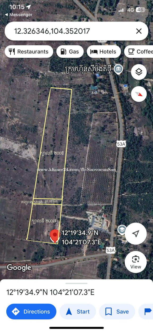 ដីចំការលក់ ៨,០០០$/ហិចតា អាចដាំដំណាំឈើហូបផ្លែ ធ្វើចំការ រស់នៅបាន ។ ដីមានទឹកអូរហូរកាត់ប្រឡាយទឹក ។