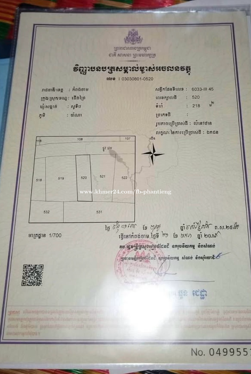 សួស្តីបងប្អូន! ខ្ញុំមានដីមួយកន្លែងចង់លក់: • ទីតាំង» កំពង់ចាម ក្បែផ្សាស្គន់1 km ជាង… • ប្រភេទដី» ដីភូមិ ជាប់ផ្លូវលំ 8ម៉ែត ចុះពីរផ្លូវជាតិលេខ6 180ម៉ែត… • ទំហំដី» 568ម៉ែតការ៉េ ផ្លង់រឹង មានទឺកស្អាត មានភ្លេីងរដ្ធ… បញ្ជាក់: ដីខ្ញុំផ្ទាល់ បងប្អូនអាចទាក់ទងបានគ្រប់ពេល 0969111xxxClick To Call អរគុណ! Telegram ដំលៃចរចារបាន បាទអរគុណ!
