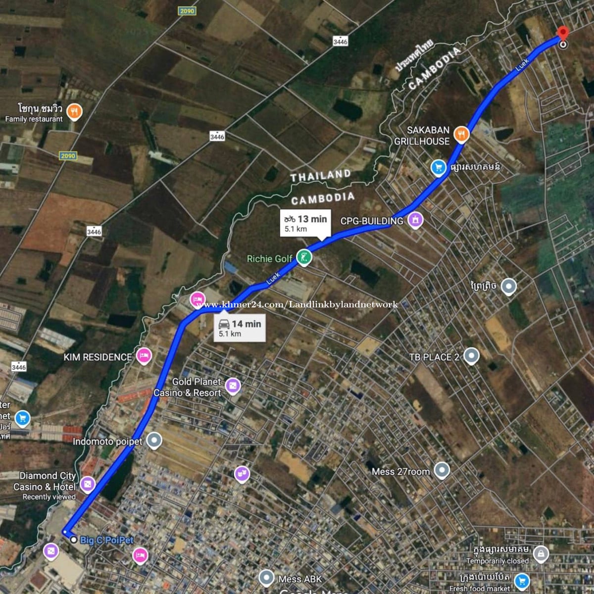 ដីមានទីតាំង 5km ពីប៊ិចស៊ី ប៉ោយប៉ែត Big C Poipet. តម្លៃលក់ $95/m2 - - - - - - - - - - - - - - - - - - នៅលើផ្លូវដើមស្រល់ កាសុីណូផ្កាយប្រាំ, ក្រុងប៉ោយប៉ែត. - តម្លៃលក់ $95/m2 - ទំហំសរុប 83169m2 - ប្លង់ : ប្លង់រឹង -ផ្លូវចេញចូល : ផ្លូវដើមស្រល់ កាសុីណូផ្កាយប្រាំ - ដីបែរទៅទិសខាងជើង 📍 ស្ថិតនៅភូមិទួលប្រាសាទ សង្កាត់ប៉ោយប៉ែត ក្រុងប៉ោយប៉ែត