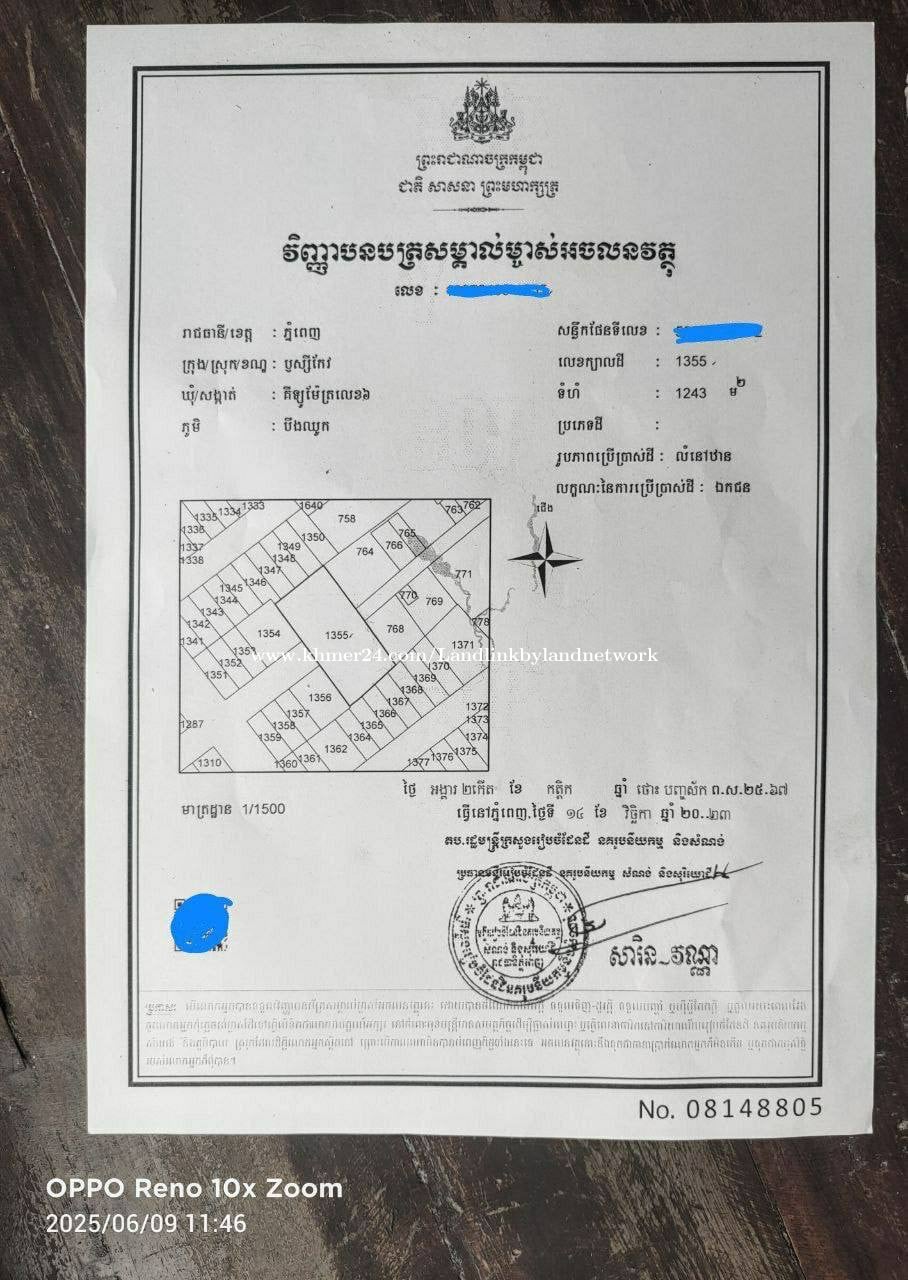 ដីលក់ ក្រុងភ្នំពេញ 1ម2=$750/m2 ដើម្បីសម្រួលដល់ការលក់ ខ្ញុំដាក់តម្លៃត្រឹមតែ ។ 1268m2