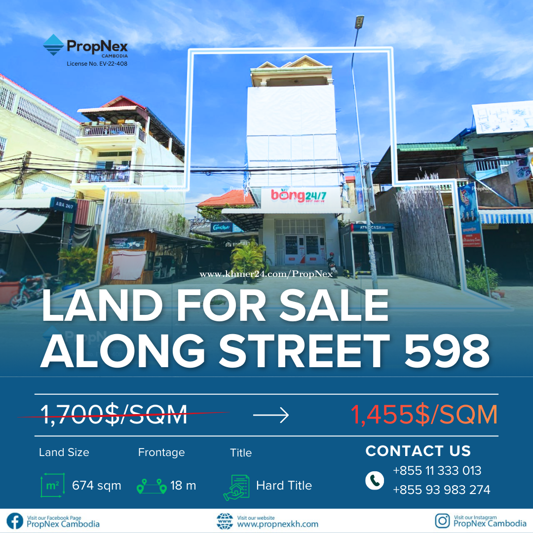 🔥 ឱកាសដ៏កម្រដីទីតំាងល្អសម្រាប់លក់ បណ្តោយផ្លូវ 598 – តម្លៃពិសេស USD 1,455/ម៉ែត្រការ៉េ! 🔥 Land for Sale Along Street 598, Khan Russey Keo, Phnom Penh – Special Price USD 1,455/sqm Only! ✨ Prime Land in a Rapidly Developing Area This outstanding property offers excellent potential for residential, commercial, or hospitality development. Strategically located along main Street 598 with additional access from a secondary road, the land provides strong visibility, smooth connectivity, and flexible development options. 📐 Land Size: 674 sqm ➡️ Frontage: 18 meters 💰 Price: USD 1,455/sqm (Reduced from USD 1,700/sqm) 📄 Title: Hard Title (LMAP) 📍 Location: Sangkat Toul Sangkae II, Khan Russey Keo, Phnom Penh 🗺 Google Map: https://maps.app.goo.gl/eWxXSREDmH9gEugn6 ⸻ 📞 Contact for Viewing & More Information: 📱 Mobile: +8551133xxxClick To Call3 / 093983xxxClick To Call 💬 Telegram: @Salen_Pot 📧 Email: sal*****@propnexkh.comClick To Sent Email 🏢 PropNex Cambodia | Your Trusted Real Estate Partner