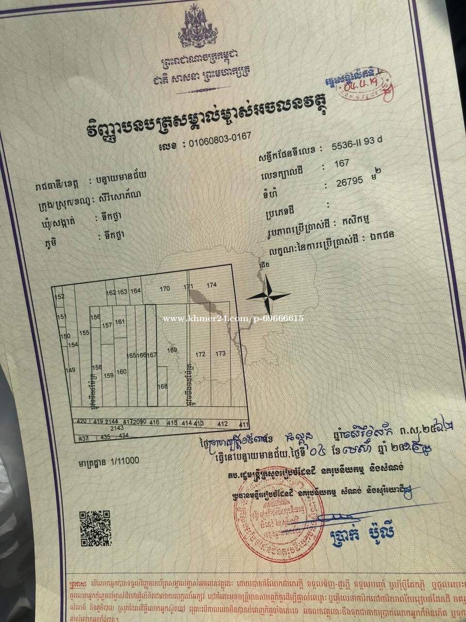 ចង់លក់ដី តំលៃពិសេស 1m2/13$ ដីល្អ ក្បាលធំ ងាយស្រួលសម្រាប់អ្នកទិញយកទៅអភិវឌ្ឍន៍💵💵ងាយៗ 👉ជាប់ផ្លូវជាតិលេខ5 ( ប្លង់រឹង ) ទំហំ 26795m2 👉ជាប់តំបន់អភិវឌ្ឍន៍ ( ការរាស់សាំង ឃ្លាំង សាលារៀន មន្ទីពេទ្យ កន្លែងកំសាន្ត)ជិតទីប្រជុំជន🏥🏩⛪️🕌🚕🚌🚵🏍 👉ជាងមួយគីឡូ ពីផ្លូវបំបែកវាងក្រុង ខេត្តបន្ទាយមានជ័យ ទីតាំង នៅភូមិទឹកថ្លា សង្កាត់ទឹកថ្លា ខេត្តបន្ទាយមានជ័យ។ Tel: 069666xxxClick To Call telegraph