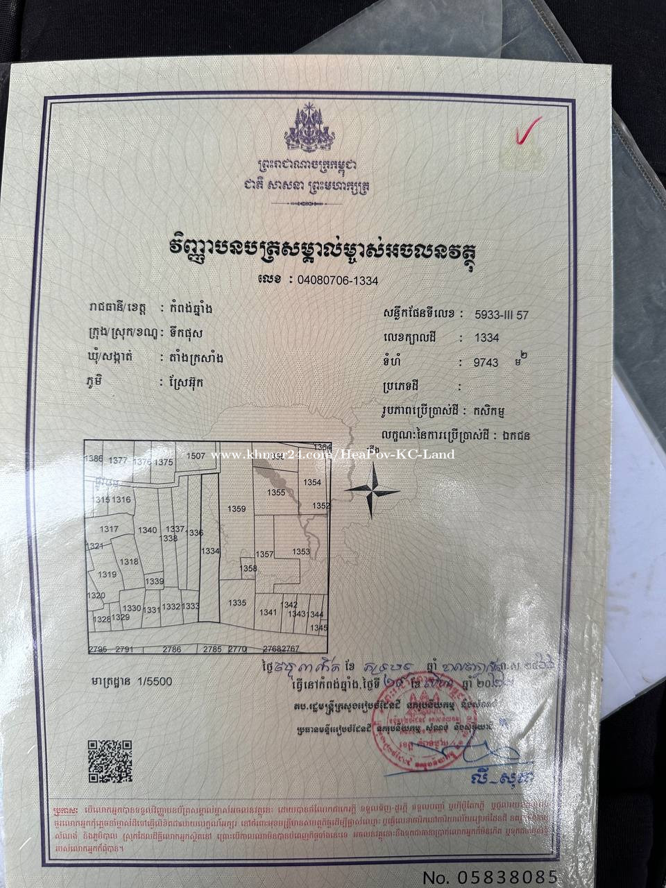 📣 #ដីលក់ជាប់ផ្លូវរដ្ឋ30មកំពុងចាក់កៅស៊ូ 👉 ទំហំ9743 ម²(40*270ម)💰តំលៃ18500$ #កាត់ប្លង់រឹងជូន 👉 ដីភូមិជាប់ផ្លូវមុខក្រោយ មានស្រះទឹក ជិតសាលារៀន ដីឡូតិ៍ សហគ្រាស កសិដ្ឋាន និងរមនីយដ្ឋាន។ 🚘 ចំងាយ13គមពីផ្លូវជាតិលេខ5 និង86គមពីភ្នំពេញ។ ⛳️ ទីតាំង: ឃុំតាំងក្រសាំង ស្រុកទឹកផុស ខេត្តកំពង់ឆ្នាំង។ ☎️098652xxxClick To Call,092202xxxClick To Call,0883433xxxClick To Call 🇰🇭តេលេក្រាម 098652xxxClick To Call
