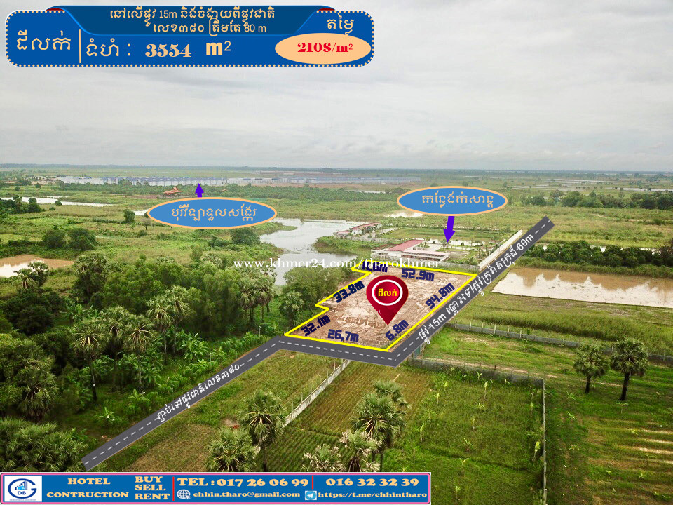 ីលក់ជាប់សាលាក្រុងអរិយក្សត្រ ឃុំអរិយក្សត្រ ភូមិទួលមាស ស្រុក ល្វាឯម ខេត្តកណ្ដាល 👉. ទំហំ: 3 554 m2 👉. ប្លង់រឹង (ស្រប់ច្បាប់ ) 👉. ជាប់ផ្លូវរដ្ឋ 15m 👉. ក្បាលដីបណ្ដោយផ្លូវប្រវែង 100m 👍. ទីតាំងជាប់សាលាក្រុងអរិយក្សត្រ 👍. ជាប់គំរោងអភិឌ្ឍន៏បុរីទួលសង្កែ 👍. តម្លៃ: 210USD/m2 (តម្លៃលក់បន្ទាន់) 💵. បញ្ជាក់: តម្លៃទាបជាងទីផ្សារ 🌏. ទីតាំងដី: https://maps.app.goo.gl/xUKV87TspLRpa8fo8?g_st=it 📍. ទ្រង់ទ្រាយដី: https://fams.app/shared/1602731974577/aoVCfq5k7R~_aOjR54IrQ 👉. សម្រាប់ពត័មានលម្អិត 017260xxxClick To Call , 016323xxxClick To Call 👉. តេលេក្រាមឆាត: https://t.me/chhintharo