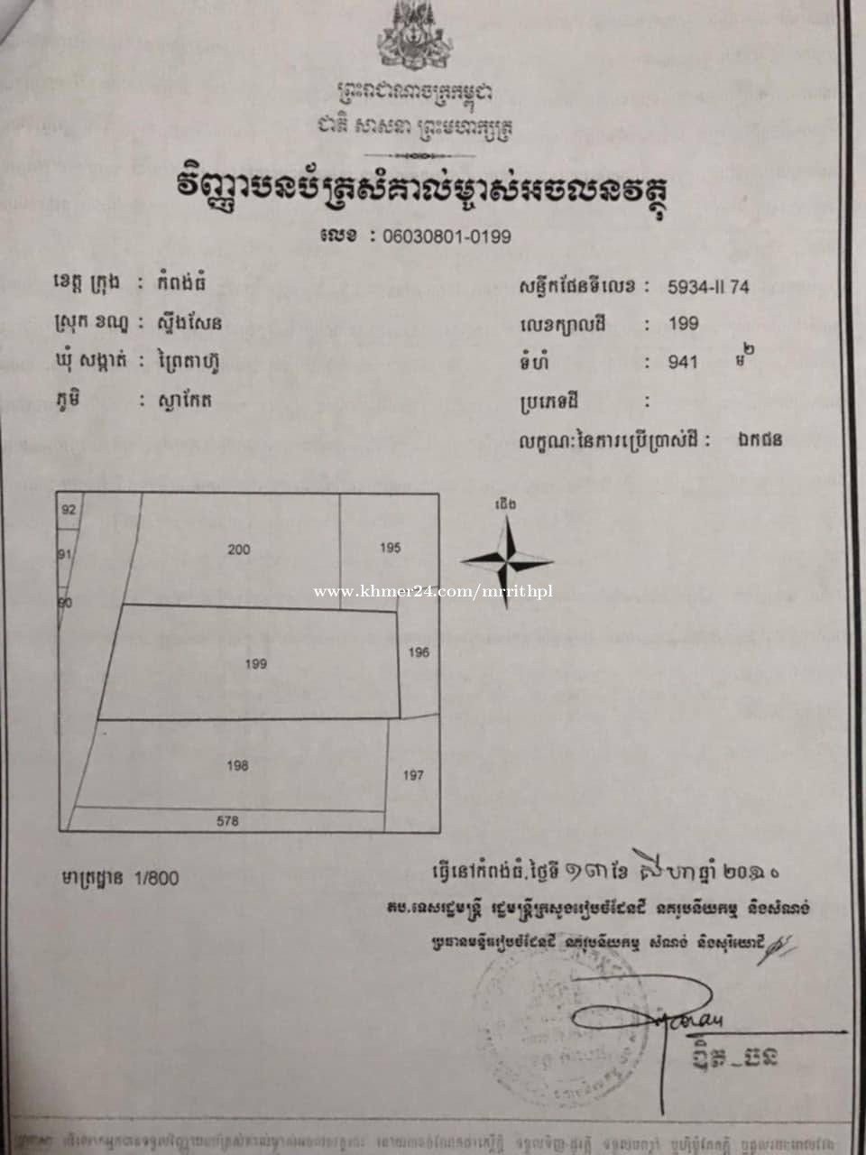 ដីលក់ក្នុង ភូមិស្លាកែត សង្កាត់ព្រៃតាហ៊ូ ក្រុងស្ទឹងសែន ខេត្តកំពង់ធំ ជិតសាលារៀន បឋមសិក្សា ស្លាកែត ។ ដីទំហំ 19x50 ជាប់ផ្លូវបេតុង ៨ម ទីតាំងល្អខ្លាំង សម្រាប់ ធ្វើផ្ទះ បន្ទប់ជួល ឬ ឃ្លាំង លេខ ទូរស័ព្ទម៉្ចាស់ដីផ្ទាល់ 0888833xxxClick To Call / 0768833xxxClick To Call