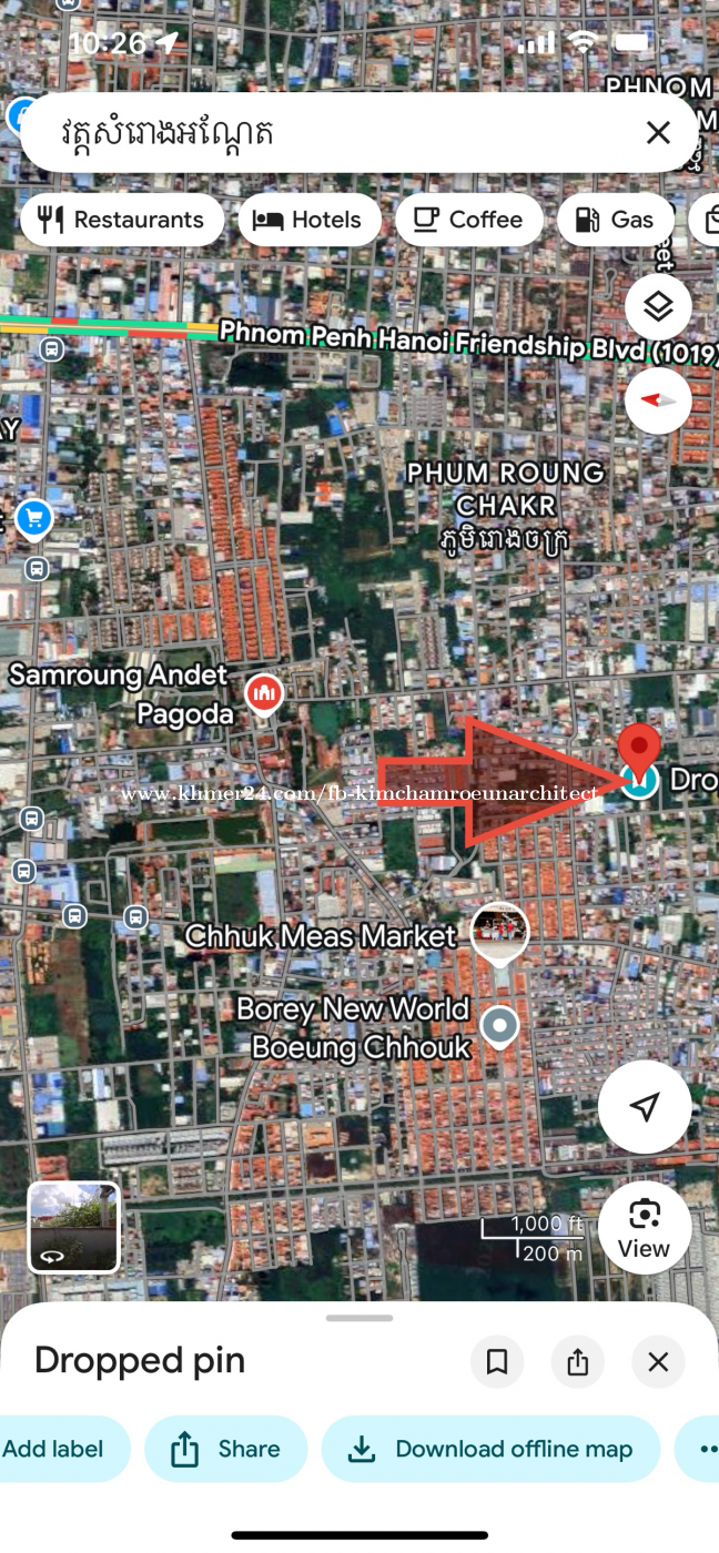 ដីទំហំ 10m x 18m នៅផ្សារឈូកមាស និងជិតសំរោងអណ្តែត កាត់ប្លង់ខ្លួនឯង