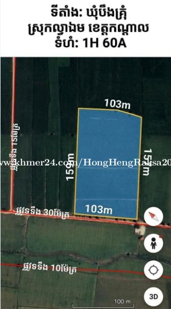 -ដីទំហំ: 1ហិចតា 60អា (នៅក្នុងស្រុកល្វាឯម) -ក្បាលដីប្រវែង 103ម៉ែត្រ ជាប់ផ្លូវគម្រោងទទឹង 30ម៉ែត្រ បណ្ដោយជាង 150ម៉ែត្រ -ប្រភេទដីស្រែខ្ពស់ ស្មើជ្រុងស្អាត ជាប់គម្រោងផ្លូវធំ និងប្រពន្ធ័ផ្លូវខ្វាត់ខ្វែងដ៏ទៃទៀតច្រើន -ជាពិសេសស្ថិតក្នុងតំបន់ដែលមានការអភិវឌ្ឍន៍ខ្លាំងនាពេលខាងមុខ -ទិញសម្រាប់ចំណេញ អាចពិចារណាបាន ព្រោះជាតម្លៃក្រោមហាងឆេង -ទីតាំង: ឃុំបឹងគ្រុំ ស្រុកល្វាឯម ខេត្តកណ្តាល -តំលៃ: $2០/m2 (ចចារបាន) -បើបងប្អូនចាប់អារម្មណ៍អាចទំនាក់ទំនងបានរយះលេខទូរសព្ទ័ 086527xxxClick To Call និងតាមតេលេក្រាមក៏បាន