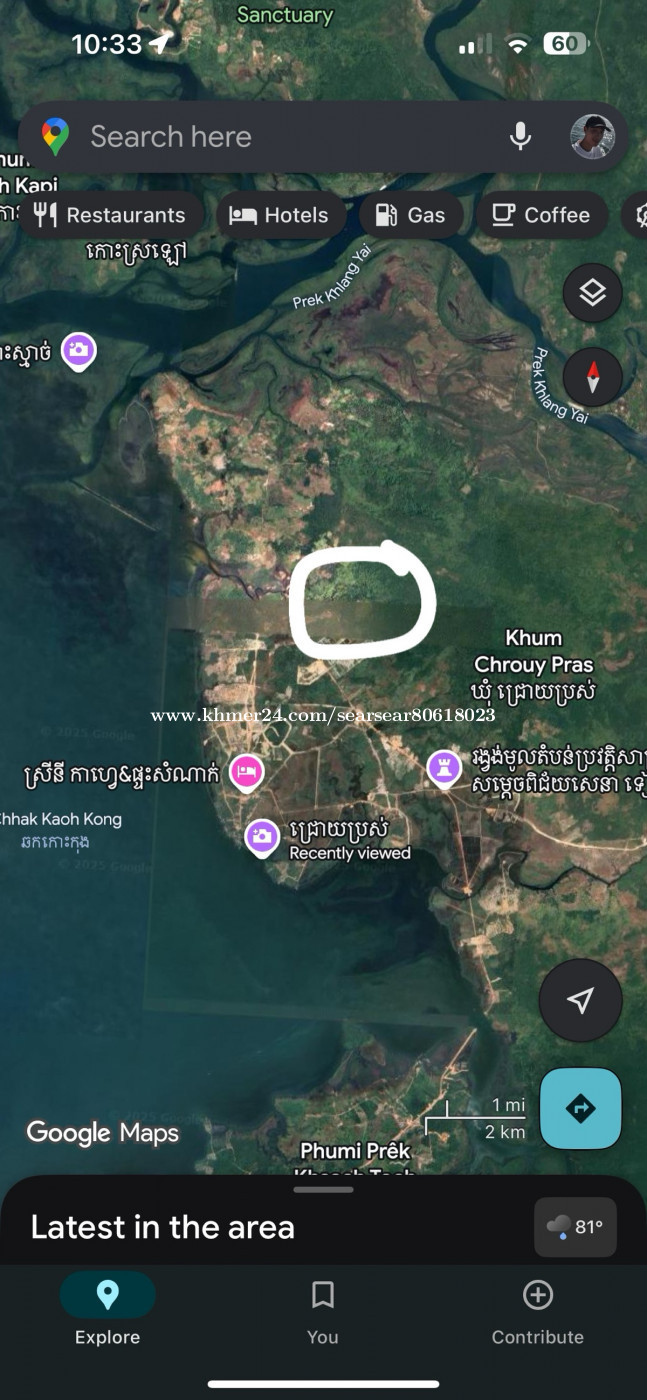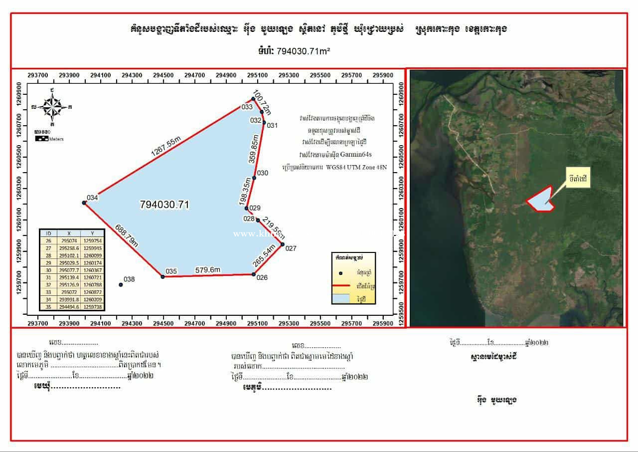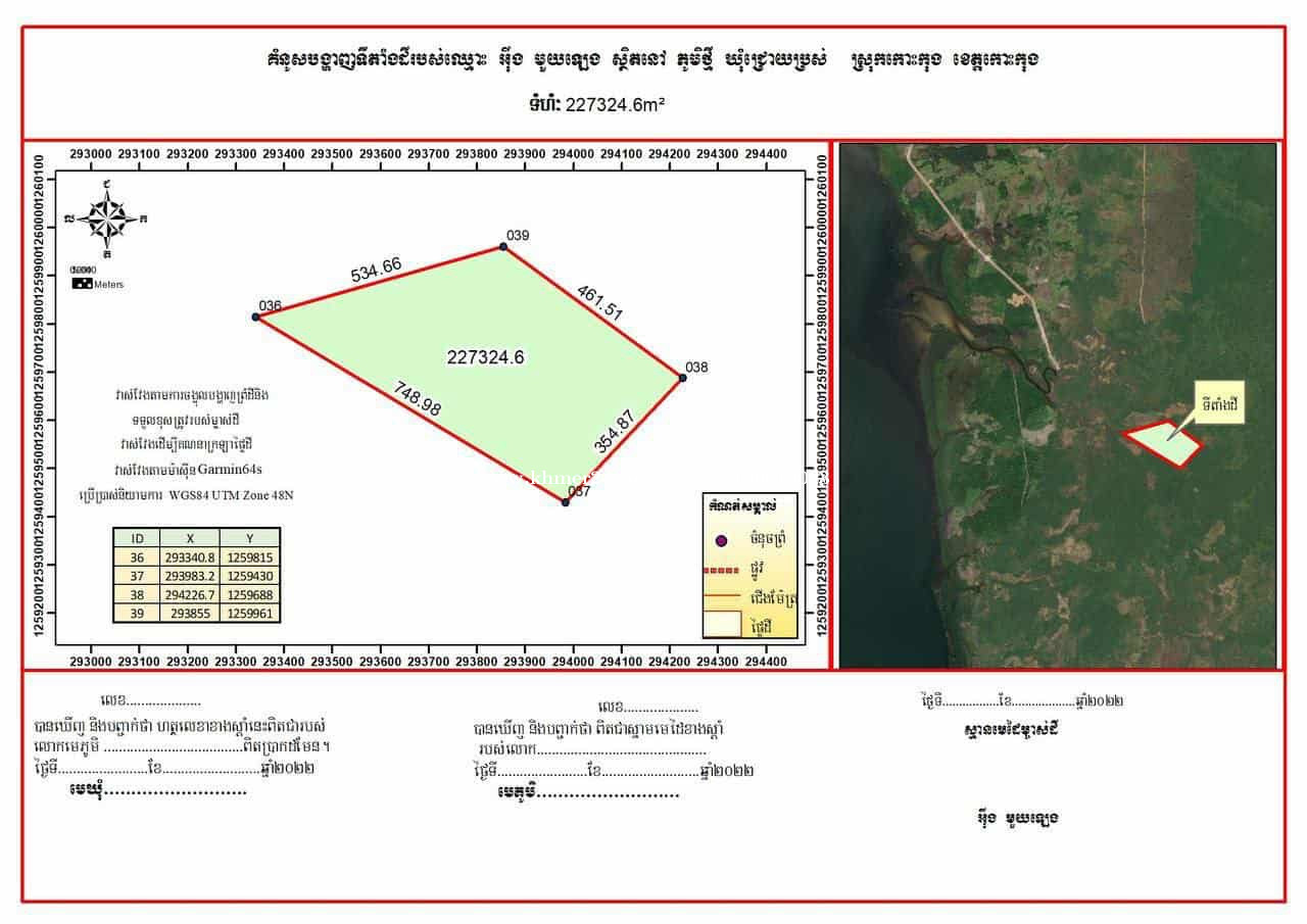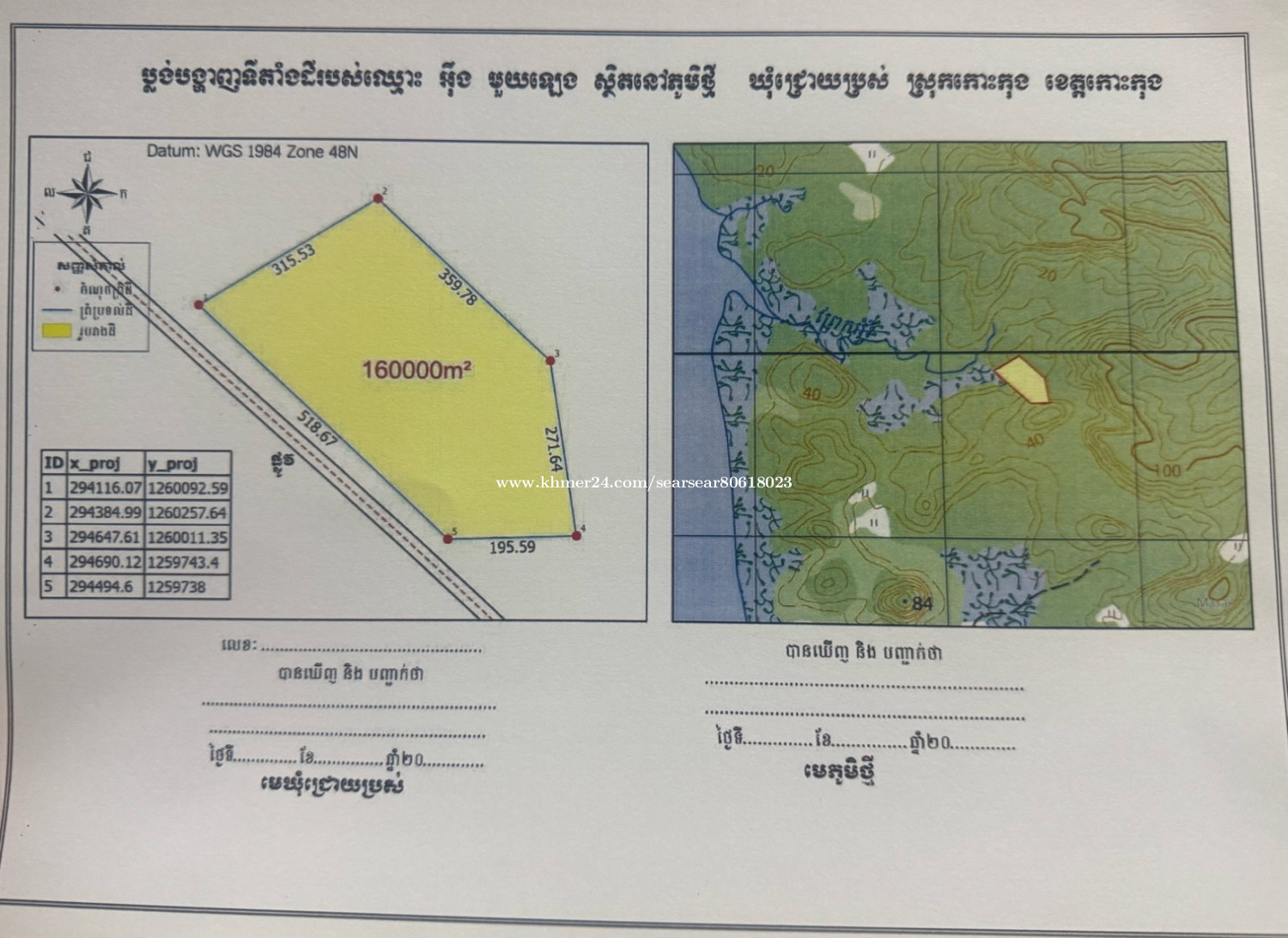 ដីលក់នៅខេត្តកោះកុង ទីតាំងដីនៅជិតឆកកោះកុងជិតសមុទ្រ។ ស្ថិតនៅខេត្តកោះកុង ឃុំជ្រោយប្រស់។ ទំហំដី 72 ហិកតា