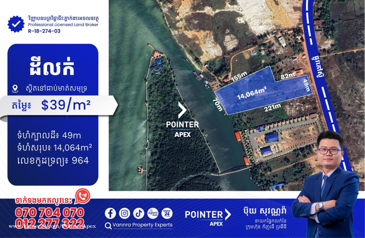 ដីលក់នៅជាប់មាត់សមុទ្រ សម្រាប់លក់:$548,496 ទំហំក្បាលដី:49m ទំហំដីសរុប:14,064m2 🔐លេខកូដអចលនវត្ថុ៖ 964 ស្ថិតនៅលើផ្លូវកៅស៊ូ30ម៉ែត្រ ភូមិនេសាទ ឃុំជ្រោយស្វាយ ស្រុកស្រែអំបិល ខេត្តកោះកុង ——————————— ទាក់ទងមកឥលូវនេះ៖ Call: 070704xxxClick To Call / 012277xxxClick To Call Telegram: https://t.me/vannraaa 微信号: vannra-experts - Channel: https://t.me/vannrapropertyexperts - Tiktok: https://www.tiktok.com/@vannra_property_experts - Facebook: https://www.facebook.com/vannra.phnompenh.property/