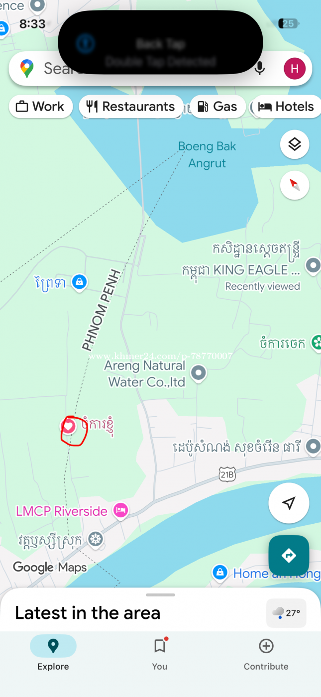 ដីលក់នៅជាប់សង្កាត់ព្រែកថ្មី ខ័ណ្ឌច្បារអំពៅ ជិតវឌ្ឍនវាយកូនគោល និងរោងចក្រកាត់ដេរយីដា ទល់មុនគំរោងអភិវឌ្ឍ ដី ៤០ហិតា ចុះពីផ្លូវជាតិ 21B ប្រហែល 200m របងព័ទ្ធ១ជុំ មានដំនាំចេកពងមាន់ពេញដី ផ្លូវចូលបេតុង6ម៉ែត ស្រួលធ្វើដំណើរ មានប្រព័ន្ធភ្លើងដល់ មានផ្ទះអ្នកស្រុករស់នៅក្បែរ ទំហំដី 10 x 8០ m តំលៃ 46900$ ចចារ បញ្ជាក់ដីប្លង់រឹង 086707xxxClick To Call ( telegram) 0977975xxxClick To Call