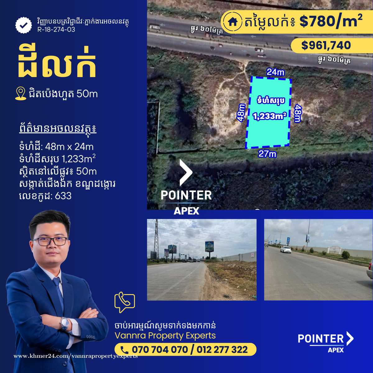 ដីសម្រាប់លក់ នៅជិតបុរីប៉េងហួត 50m សម្រាប់លក់| $ 961,740| ទំហំដី: 48m x 24m 🔐លេខកូដអចលនវត្ថុ៖ 633 📌 លើផ្លូវ 50m សង្កាត់ជើងឯក ខណ្ឌដង្កោ ភ្នំពេញ ——————————— ទាក់ទងមកឥលូវនេះ៖ Call: 070704xxxClick To Call / 012277xxxClick To Call Telegram: https://t.me/vannraaa 微信号: vannra-experts - Channel: https://t.me/vannrapropertyexperts - Tiktok: https://www.tiktok.com/@vannra_property_experts - Facebook: https://www.facebook.com/vannra.phnompenh.property/