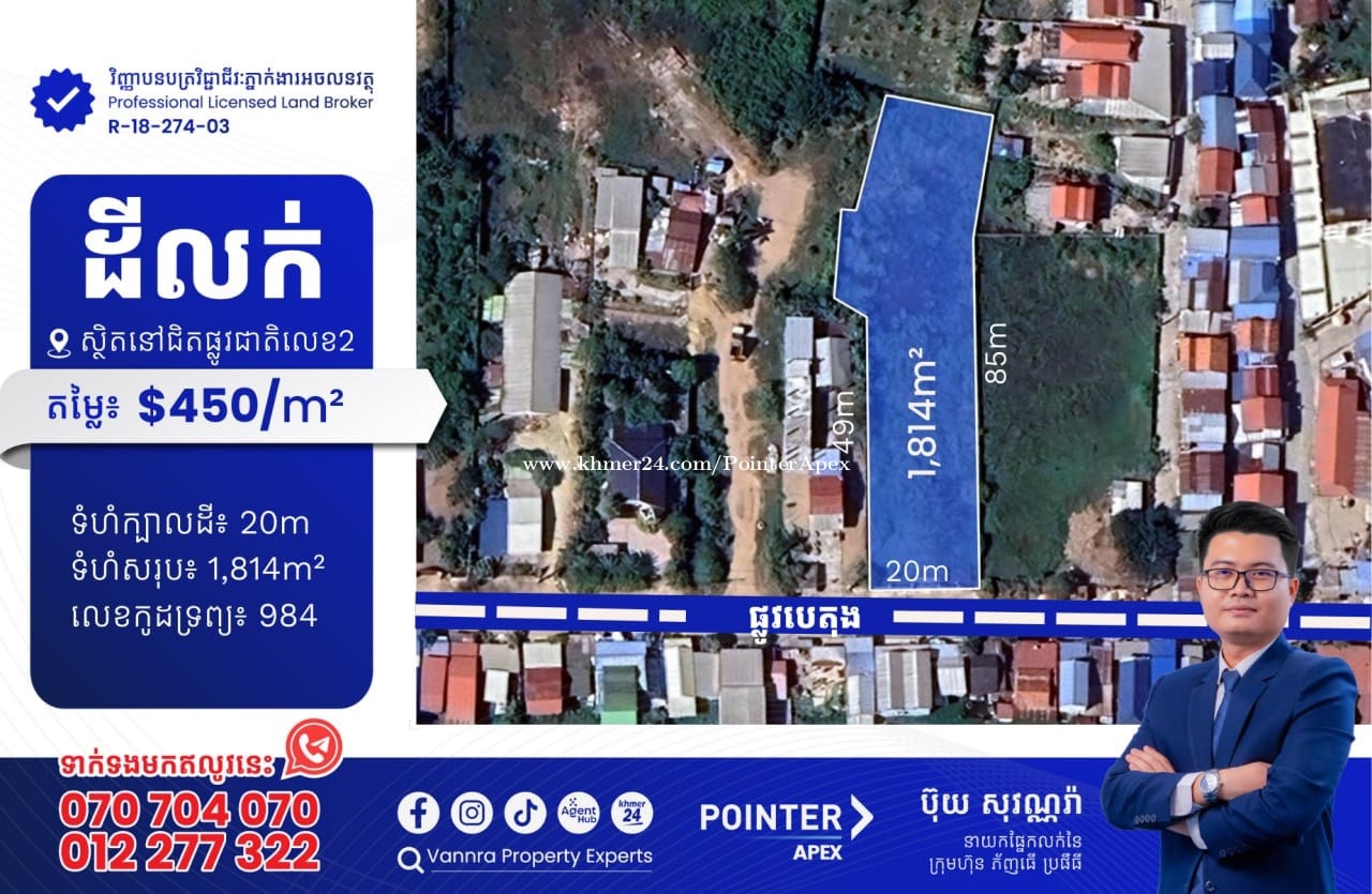 ដីសម្រាប់លក់ជិតផ្លូវជាតិលេខ2 និងផ្លូវ80m សម្រាប់លក់: $450/m² ឬ $816,300 ទំហំក្បាលដី: 20m ទំហំដីសរុប: 1,814m² 🔐លេខកូដអចលនវត្ថុ៖ 984 ស្ថិតនៅលើផ្លូវបេតុង សង្កាត់ព្រែកកំពឹស ខណ្ឌដង្កោ ភ្នំពេញ ——————————— ទាក់ទងមកឥលូវនេះ៖ Call: 070704xxxClick To Call / 012277xxxClick To Call Telegram: https://t.me/vannraaa 微信号: vannra-experts - Channel: https://t.me/vannrapropertyexperts - Tiktok: https://www.tiktok.com/@vannra_property_experts - Facebook: https://www.facebook.com/vannra.phnompenh.property/