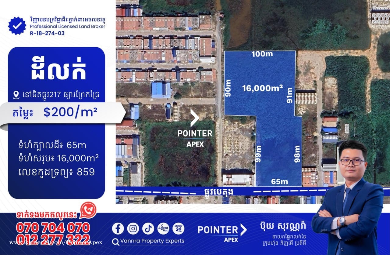 ដីលក់នៅជិតផ្លូវជាតិលេខ217 ផ្សារព្រែកជ្រៃ សម្រាប់លក់: $200/m² ឬ $3,200,000 ទំហំក្បាលដី:65m ទំហំដីសរុប: 16,000m² 🔐លេខកូដអចលនវត្ថុ៖ 859 ស្ថិតនៅលេីផ្លូវបេតុង15mជិតផ្លូវ217 សង្កាត់ស្ពានថ្ម ខណ្ឌដង្កោ ភ្នំពេញ ——————————— ទាក់ទងមកឥលូវនេះ៖ Call: 070704xxxClick To Call / 012277xxxClick To Call Telegram: https://t.me/vannraaa 微信号: vannra-experts - Channel: https://t.me/vannrapropertyexperts - Tiktok: https://www.tiktok.com/@vannra_property_experts - Facebook: https://www.facebook.com/vannra.phnompenh.property/