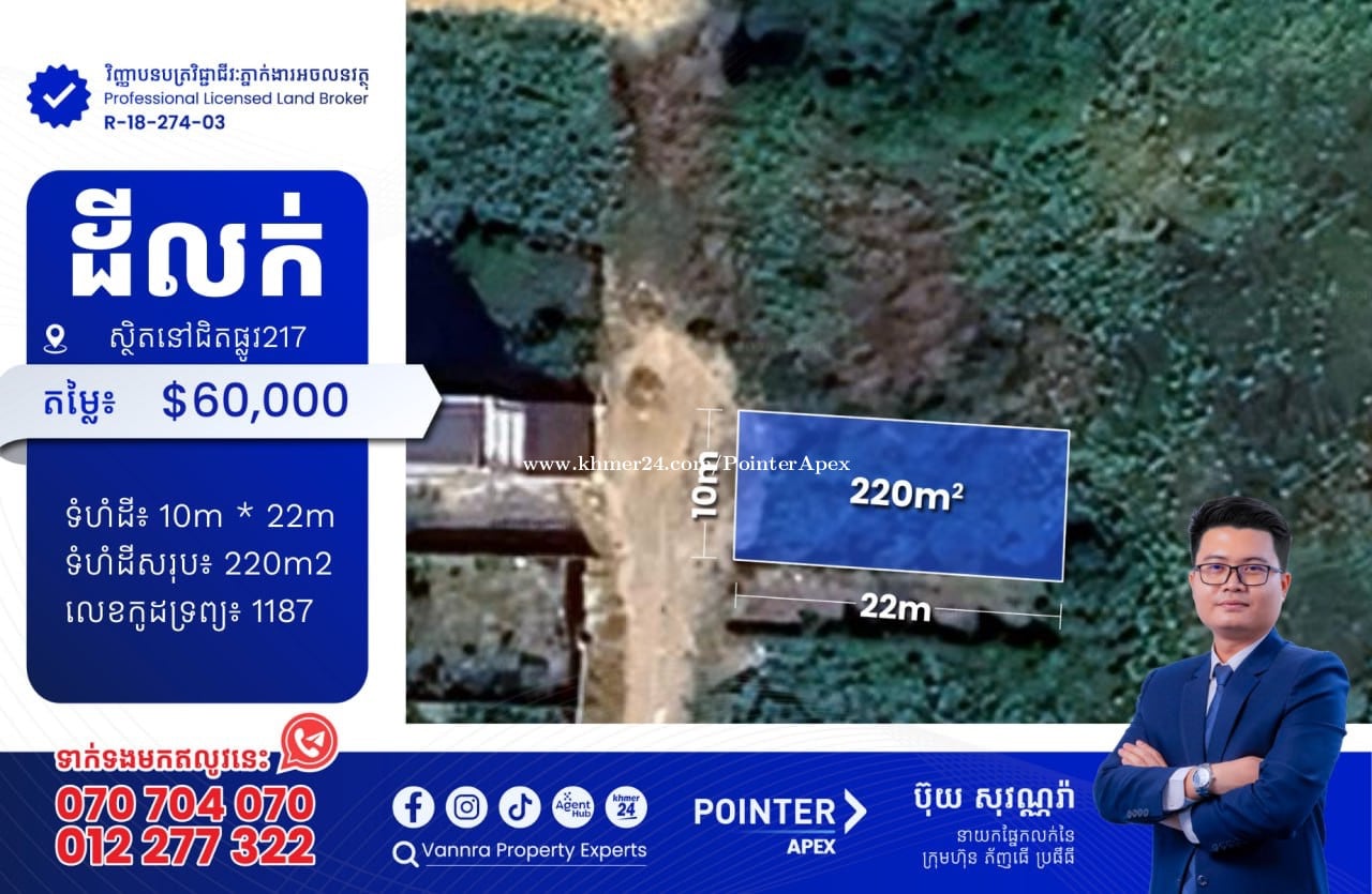 ដីលក់នៅជិតផ្លូវ217 សម្រាប់លក់: $60,000 ទំហំដី: 10m x 22m ទំហំដីសរុប: 220m² 🔐លេខកូដអចលនវត្ថុ៖ 1187 ស្ថិតនៅជិតផ្លូវ 217សង្កាត់ជើងឯក ខណ្ឌដង្កោ ភ្នំពេញ ——————————— ទាក់ទងមកឥលូវនេះ៖ Call: 070704xxxClick To Call / 012277xxxClick To Call Telegram: https://t.me/vannraaa 微信号: vannra-experts - Channel: https://t.me/vannrapropertyexperts - Tiktok: https://www.tiktok.com/@vannra_property_experts - Facebook: https://www.facebook.com/vannra.phnompenh.property/