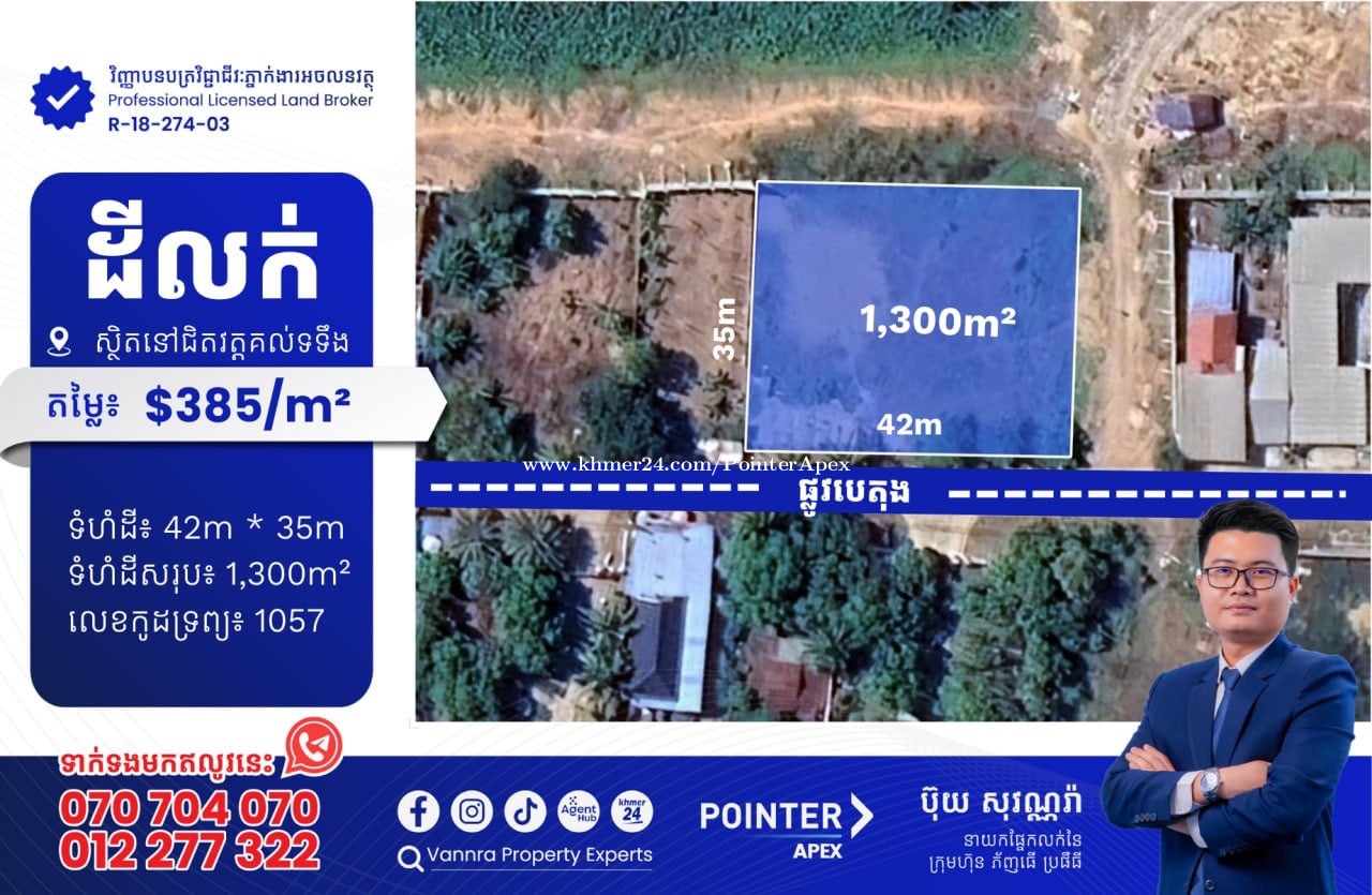 ដីលក់នៅជិតវត្តគល់ទទឹង សម្រាប់លក់: $385/m² ឬ$500,000 ទំហំដី: 42m x 35m ទំហំដីសរុប: 1,300m² 🔐លេខកូដអចលនវត្ថុ៖ 1057 ស្ថិតនៅលើផ្លូវបេតុងសង្កាត់ព្រែកថ្មី ខណ្ឌច្បារអំពៅ ភ្នំពេញ ——————————— ទាក់ទងមកឥលូវនេះ៖ Call: 070704xxxClick To Call / 012277xxxClick To Call Telegram: https://t.me/vannraaa 微信号: vannra-experts - Channel: https://t.me/vannrapropertyexperts - Tiktok: https://www.tiktok.com/@vannra_property_experts - Facebook: https://www.facebook.com/vannra.phnompenh.property/