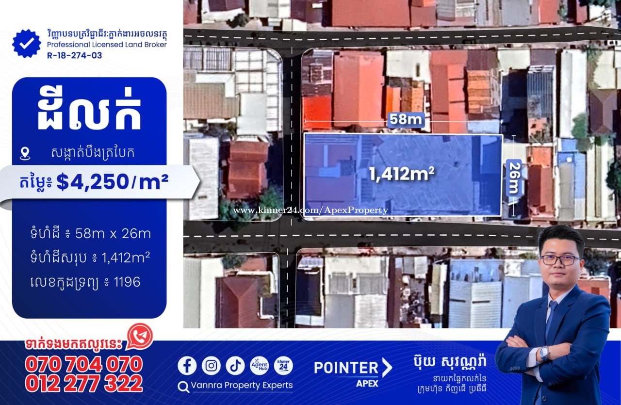 ដីលក់នៅបឹងត្របែក សម្រាប់លក់:$4,250/m² ឬ $6,000,000 ទំហំដី: 58m x 26m ទំហំដីសរុប: 1,412m² 🔐លេខកូដអចលនវត្ថុ៖ 1196 ស្ថិតនៅលើផ្លូវលេខ 99 សង្កាត់បឹងត្របែក ខណ្ឌចំការមន ភ្នំពេញ ——————————— ទាក់ទងមកឥលូវនេះ៖ Call: 070704xxxClick To Call / 012277xxxClick To Call Telegram: https://t.me/vannraaa 微信号: vannra-experts - Channel: https://t.me/vannrapropertyexperts - Tiktok: https://www.tiktok.com/@vannra_property_experts - Facebook: https://www.facebook.com/vannra.phnompenh.property/