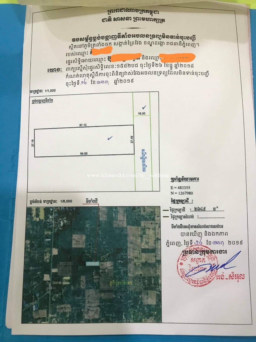 ដីលក់តំលៃ 155$/1m2 នៅភូមិត្រពាំងចក សង្កាត់ព្រៃវែង ខណ្ឌដង្កោក្បែរបុរីទីលានទំហំ20ហ ចំណាយប្រហែល300មពីផ្លូវព្រៃសរ ដីទទឹង27.5ម ជំរៅ97ម https://maps.app.goo.gl/j3SQBF3puroVLubd8
