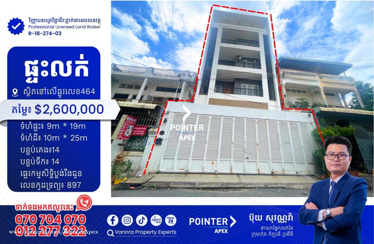 ផ្ទះលក់នៅលើផ្លូវ464 សម្រាប់លក់: $2,600,000 ទំហំដី: 10m x 25m ទំហំផ្ទះ: 9m x 19m បន្ទប់គេង:14 បន្ទប់ទឹក:14 🔐លេខកូដអចលនវត្ថុ៖ 897 ស្ថិតនៅលើផ្លូវលេខ 464 សង្កាត់ទួលទំពូង2 ខណ្ឌចំការមន ភ្នំពេញ ——————————— ទាក់ទងមកឥលូវនេះ៖ Call: 070704xxxClick To Call / 012277xxxClick To Call Telegram: https://t.me/vannraaa 微信号: vannra-experts - Channel: https://t.me/vannrapropertyexperts - Tiktok: https://www.tiktok.com/@vannra_property_experts - Facebook: https://www.facebook.com/vannra.phnompenh.property/