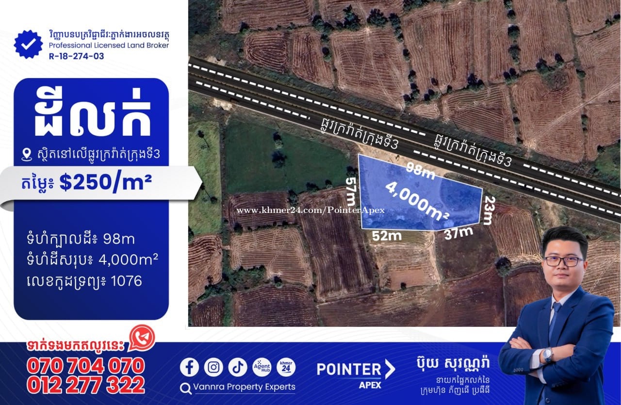ដីលក់នៅលើផ្លូវក្រវ៉ាត់ក្រុងទី3 សម្រាប់លក់: $250/m² ឬ $1,000,000 ទំហំក្បាលដី: 98m ទំហំដីសរុប: 4,000m² 🔐លេខកូដអចលនវត្ថុ៖ 1076 ស្ថិតនៅលើផ្លូវក្រវ៉ាត់ក្រុងទី3 សង្កាត់សាក់សំពៅ ខណ្ឌដង្កោ ភ្នំពេញ ——————————— ទាក់ទងមកឥលូវនេះ៖ Call: 070704xxxClick To Call / 012277xxxClick To Call Telegram: https://t.me/vannraaa 微信号: vannra-experts - Channel: https://t.me/vannrapropertyexperts - Tiktok: https://www.tiktok.com/@vannra_property_experts - Facebook: https://www.facebook.com/vannra.phnompenh.property/