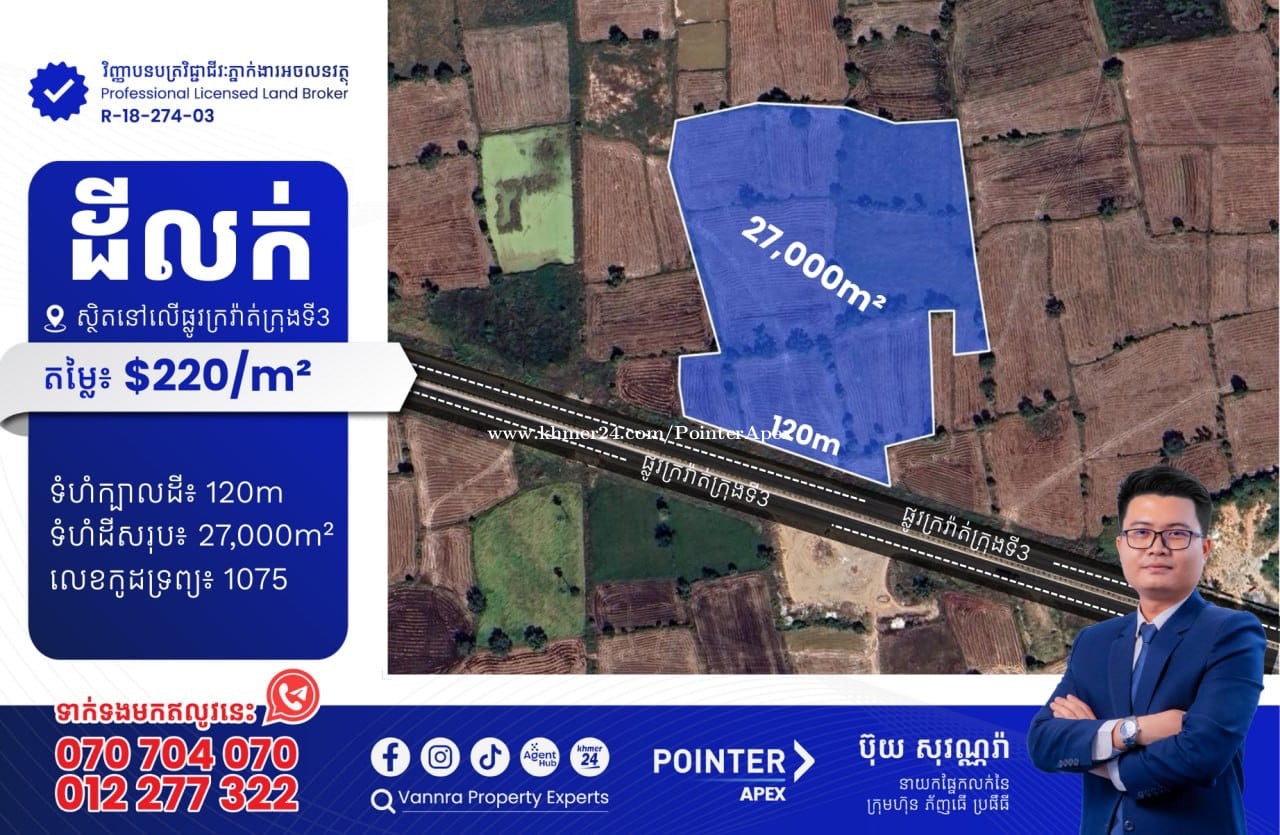 ដីលក់នៅលើផ្លូវក្រវ៉ាត់ក្រុងទី3 សម្រាប់លក់: $220/m² ឬ $5,940,000 ទំហំក្បាលដី: 120m ទំហំដីសរុប: 27,000m² 🔐លេខកូដអចលនវត្ថុ៖ 1075 ស្ថិតនៅលើផ្លូវក្រវ៉ាត់ក្រុងទី3 សង្កាត់សាក់សំពៅ ខណ្ឌដង្កោ ភ្នំពេញ ——————————— ទាក់ទងមកឥលូវនេះ៖ Call: 070704xxxClick To Call / 012277xxxClick To Call Telegram: https://t.me/vannraaa 微信号: vannra-experts - Channel: https://t.me/vannrapropertyexperts - Tiktok: https://www.tiktok.com/@vannra_property_experts - Facebook: https://www.facebook.com/vannra.phnompenh.property/