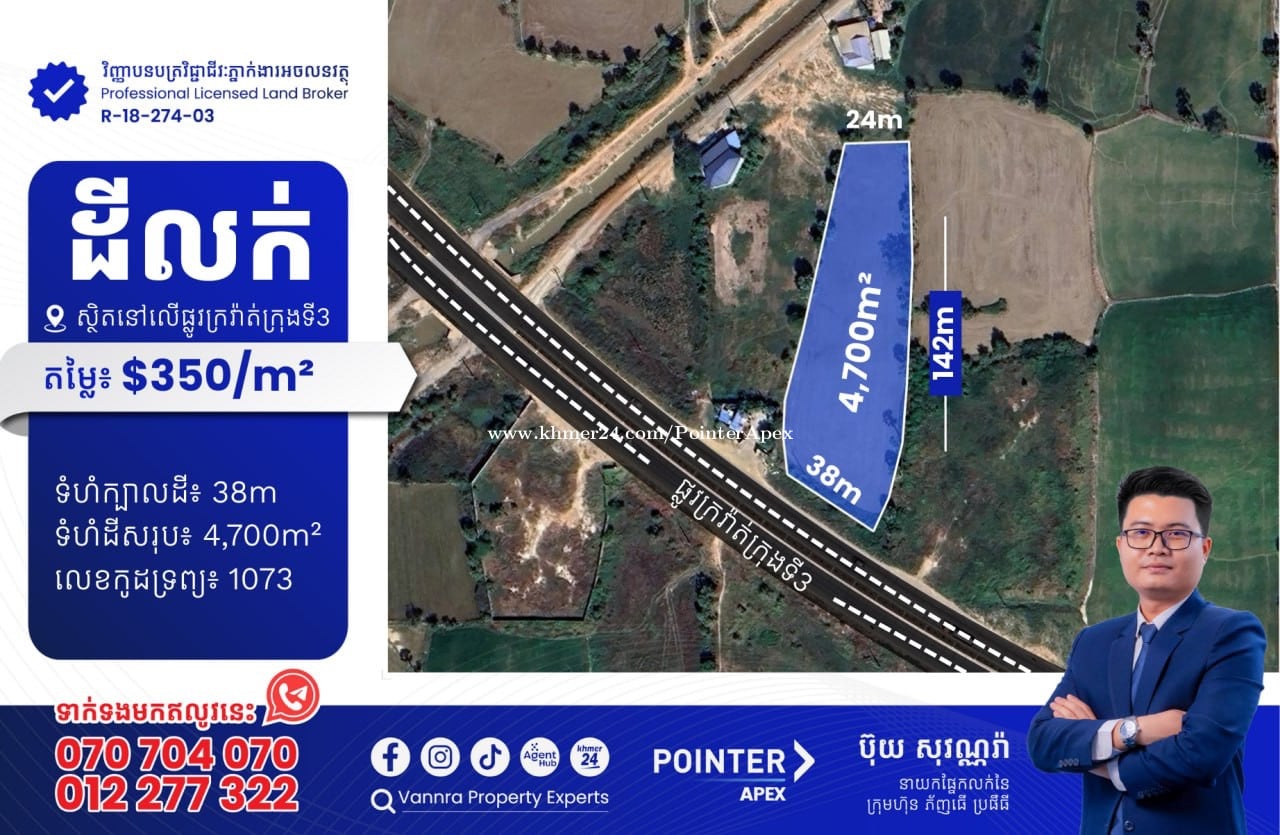 ដីលក់នៅលើផ្លូវក្រវ៉ាត់ក្រុងទី3 សម្រាប់លក់: $350/m² ឬ $1,645,000 ទំហំក្បាលដី: 38m ទំហំដីសរុប: 4,700m² 🔐លេខកូដអចលនវត្ថុ៖ 1073 ស្ថិតនៅលើផ្លូវក្រវ៉ាត់ក្រុងទី3 សង្កាត់ទៀន ខណ្ឌដង្កោ ភ្នំពេញ ——————————— ទាក់ទងមកឥលូវនេះ៖ Call: 070704xxxClick To Call / 012277xxxClick To Call Telegram: https://t.me/vannraaa 微信号: vannra-experts - Channel: https://t.me/vannrapropertyexperts - Tiktok: https://www.tiktok.com/@vannra_property_experts - Facebook: https://www.facebook.com/vannra.phnompenh.property/