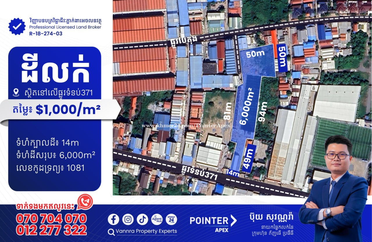 ដីលក់នៅលើផ្លូវទំនប់371 សម្រាប់លក់: $1,000/m² ឬ$6,000,000 ទំហំក្បាលដី: 14m ទំហំដីសរុប: 6,000m² 🔐លេខកូដអចលនវត្ថុ៖ 1081 ស្ថិតនៅលើផ្លូវទំនប់ 371 សង្កាត់បឹងទំពុន2 ខណ្ឌមានជ័យ ភ្នំពេញ ——————————— ទាក់ទងមកឥលូវនេះ៖ Call: 070704xxxClick To Call / 012277xxxClick To Call Telegram: https://t.me/vannraaa 微信号: vannra-experts - Channel: https://t.me/vannrapropertyexperts - Tiktok: https://www.tiktok.com/@vannra_property_experts - Facebook: https://www.facebook.com/vannra.phnompenh.property/