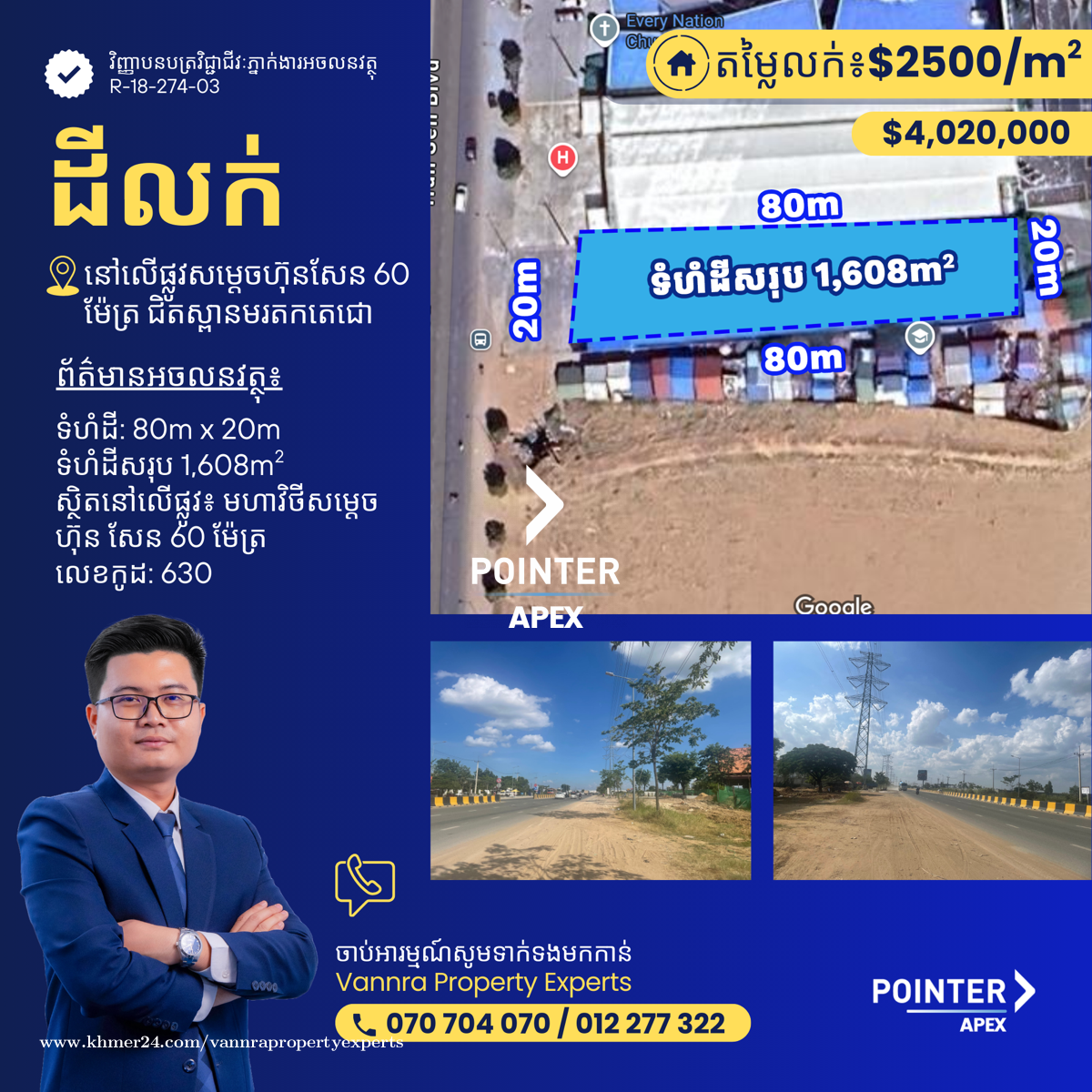 ដីសម្រាប់លក់ នៅលើផ្លូវសម្ដេចហ៊ុនសែន 60 ម៉ែត្រ សម្រាប់លក់| $ 4,020,000 ទំហំដី: 20m x 80m 🔐លេខកូដអចលនវត្ថុ៖ 630 📌 លើផ្លូវ មហាវិថីសម្ដេចហ៊ុនសែន សង្កាត់ចាក់អង្រែលើ ខណ្ឌមានជ័យ ——————————— ទាក់ទងមកឥលូវនេះ៖ Call: 070704xxxClick To Call / 012277xxxClick To Call Telegram: https://t.me/vannraaa 微信号: vannra-experts - Channel: https://t.me/vannrapropertyexperts - Tiktok: https://www.tiktok.com/@vannra_property_experts - Facebook: https://www.facebook.com/vannra.phnompenh.property/
