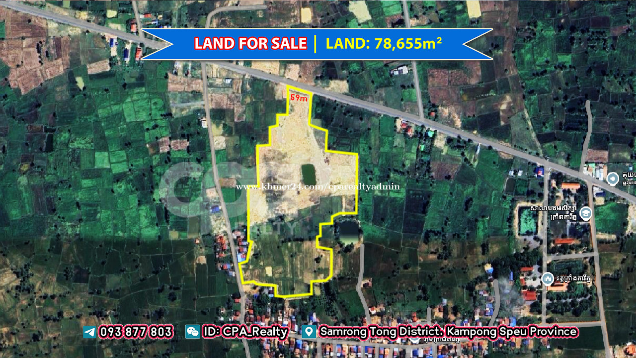 ⭕️ដីលក់នៅសំរោងទង ខេត្តកំពង់ស្ពឺ 🆔12181-1 💢ទំហំដី: 78,655m2 💢ប្រវែងជាប់ផ្លូវកៅស៊ូ៥៩ម៉ែត្រ 💢តម្លៃលក់: $2,100,000 ចរចារ 💢ទីតាំងនេះអាចសាងសង់ជារោងចក្រ, កសិដ្ឋាន, ... 📍google map: https://h7.cl/1fhZl ☎️ 𝟎𝟗𝟑 𝟖𝟕𝟕 𝟖𝟎𝟑 𝙩𝙚𝙡𝙚𝙜𝙧𝙖𝙢: https://t.me/cparealtors 𝙬𝙚𝙘𝙝𝙖𝙩 𝙄𝘿: 𝘾𝙋𝘼_𝙍𝙚𝙖𝙡𝙩𝙮 𝙩𝙚𝙡𝙚𝙜𝙧𝙖𝙢 𝙘𝙝𝙖𝙣𝙣𝙚𝙡: https://t.me/cparealty