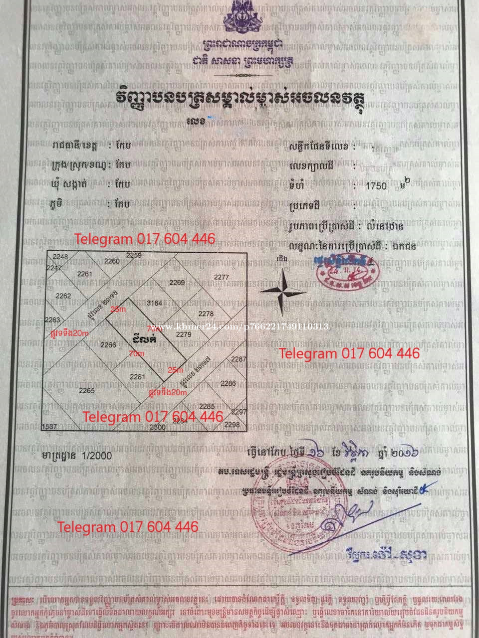 #ដលក់បន្ទាន់ក្នុងក្រុងកែប តំបន់ឡូត៌ B តម្លៃក្រោមទីផ្សារ 60% ម្ចាស់លក់បន្ទាន់ 🌍//ទីតាំង ភូមិកែប សង្កាត់កែប ក្រុងកែប ខេត្តកែប 📝//ទំហំដី 1750 ម៉ែត្រការេ(25m x 70m) 💵//តម្លៃលក់ 85$/m² 📝//ឯកសារ( ប្លង់រឹងលំនៅឋាន ) 🚙// ផ្លូវ 20m មុខ និង ក្រោយដី 🥰//ដីស្អាត ទីតាំងល្អ សម្រាប់ពុកម៉ែ បងប្អូនមានចំណាប់អារម្មណ៍ចង់សាង ផ្ទះលំហែរអែមណាស់ ជាពិសេសទិញទុកចំនេញថ្ងៃខាងមុខ ក៏ បាន👌 👉សម្រាប់ពុកម៉ែបងប្អូនចាប់អារម្មអាចទំនាក់ទំនងមកខ្ញុំបាទ ☎️0976076xxxClick To Call
