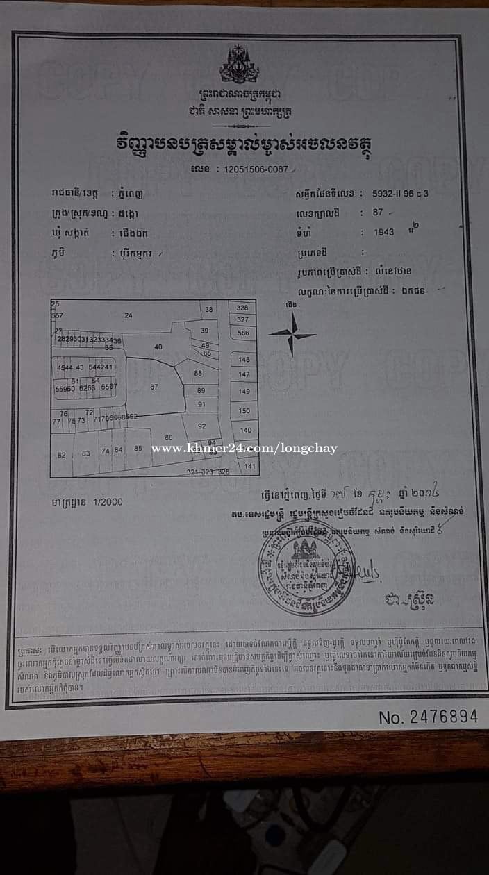 ទើបប្រកាសបើកលក់ដីឡូតិ៍ស្លិតនៅតំបន់មានប្រព័ន្ធគ្រប់គ្រាន់មានប្លង់រឹងស្រាប់សុវត្ថភាពគ្រប់ពេលអាចធ្វើសំណង់តាមតំរូវការនិងទំហំតាមការចង់បានធំជាងនេះតំលៃអាចចុះបានបន្តិចទៀតបើចាប់អារម្មណ៍អាចទាក់ទងម្ចាស់ផ្ទាល់គ្រប់ពេលវេលាមានចំងាយពីវត្តភ្នំ១២kmនិងចំងាយពី Aeon ៣ មានជ័យផ្លូវ60m ប្រហែល3km ជិតរោងចក្រ Cambodia Beer និងសារៈមន្ទីរជើងឯក។ 10mX45=$239,000