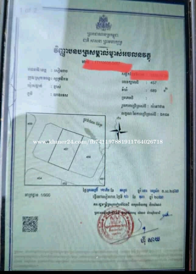 ដីលក់20mx34m={689m លក់តម្លៃ11000$ចរចាបាន ដីប្លង់រឹង ផ្លូវកៅស៊ូ30ម.មុខ.ផ្លូវក្រហម15ម.ក្រោយ ទីតងដី.ភូមិយាងទេស.ឃុំខ្ចាស.ស្រុកសូទ្រនិគម.ខេត្ដសៀមរាប។ សូមទំនាក់ទំនងតាមលេខតេលេក្រាម070747xxxClick To Call/0977940xxxClick To Call