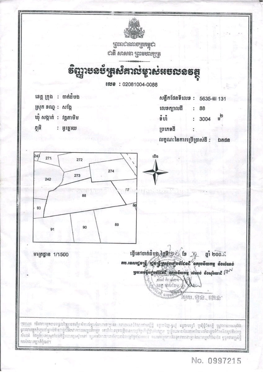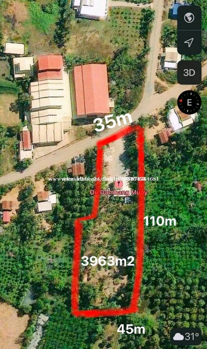 ដីចំការជាប់និងផ្លូវកៅស៊ូរ ក្បាល៣៥បណ្តាយ១១០ នៅចំផ្លូវបំបែកជា៣ ទាល់មុខរោងចក្រទឹកកក ចុះពីរផ្លូវហៃវែចំម្ងាយ២គីទ្បូម៉ែត ដីហុងស៊ុយល្អអាចបើកលក់ដូរឬធ្វើអាជីវកម្មបាន តំលៃអាចចចារបានទៀត