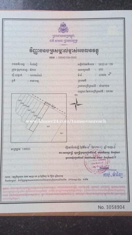 ដីលក់បន្ទាន់ស្ថិតនៅជាប់រម្មណីយ៍ដ្ឋានភ្នំចាស់អាចបេីកជាការ៉ាស់សាំងនិងរីស៊តបាន ភូមិមនោរម្យ ឃុំហោងសំណំ ស្រុកឱរ៉ាល់ ខេត្តកំពង់ស្ពឺ ក្បាលដីជាប់ផ្លូវជាតិលេខ៤៤មានទំហំ៦០ម៉ែត្រ កន្ទុយដីជាប់ផ្លូវក្រួសក្រហម