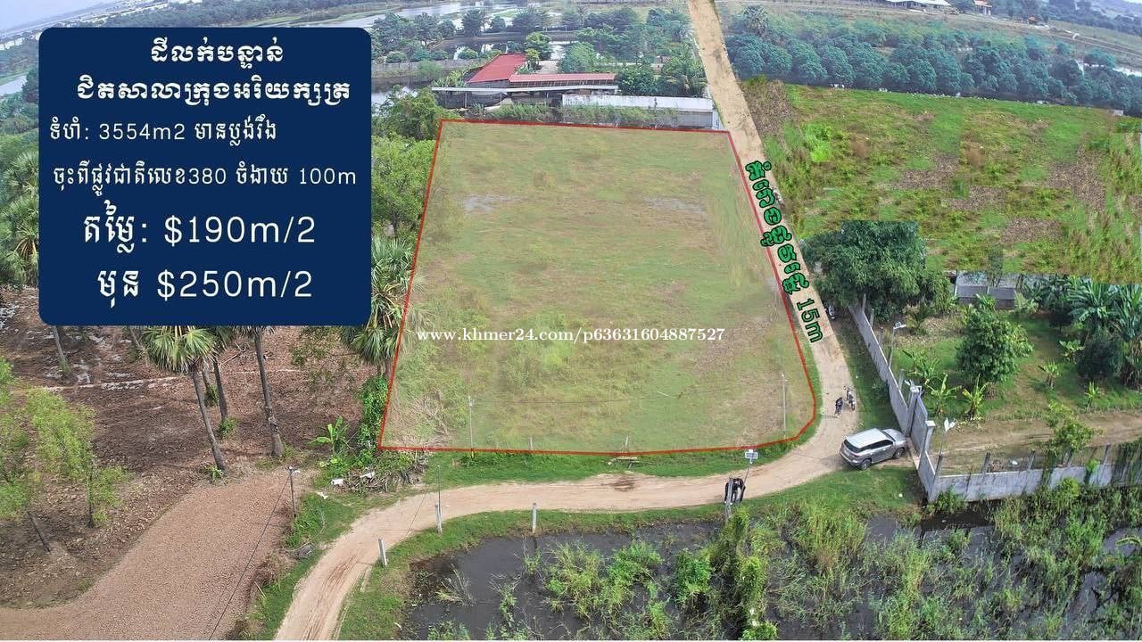 ដីលក់បន្ទាន់ នៅ ក្រុងអរិយក្សត្រ 📍ទីតាំងចេញពីកំពង់ចម្លងអរិយក្សត្រខ្ទង់2.5គីឡូ និងជិតសាលាក្រុងអរិយក្សត្រ 👉ទំហំដីសរុប 3554m² (ប្លង់រឹង) 👉ជាប់គម្រោងផ្លូវរដ្ឋ15m ចុះពីផ្លូវ40ម៉ែត្រ ប្រហែល100m 👉តម្លៃលក់បច្ខុប្បន្នត្រឹមតែ $190/m² ☎️សម្រាប់ព័ត៌មានបន្ថែម៖ 012812xxxClick To Call/ 015812xxxClick To Call/ 087812xxxClick To Call