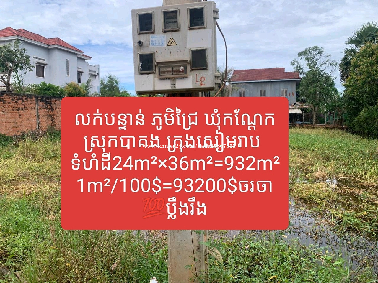 នៅខាងក្រោយសាលាវិទ្យាល័យស្វាយឆ្នាំក្រោយផ្លូវមុខដីនិងចាក់បេតុង ដីលក់បន្ទាន់ ភូមិជ្រៃ ឃុំកណ្តែក ស្រុកបាគង ក្រុងសៀមរាប ទំហំដី24m²×36m²=932m² 1m²/100$=93200$ចរចា