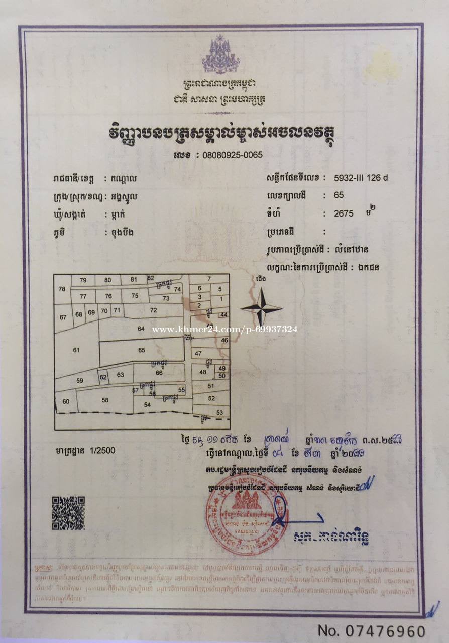 ដីនៅជាប់ផ្លូវូធំ ទំហំ ខាងមុខ 27ម ខាងក្រោយ 38ម ប្រវែង មុខដល់ក្រោយ 97ម ទំហំ សរុប 2675មែត្រការ៉េ ទីតាំង នៅភូមិចុងបឹង សង្កាត់ ម្កាក់ ស្រុក អង្គស្នួួល ខេត្ត កណ្ដាល