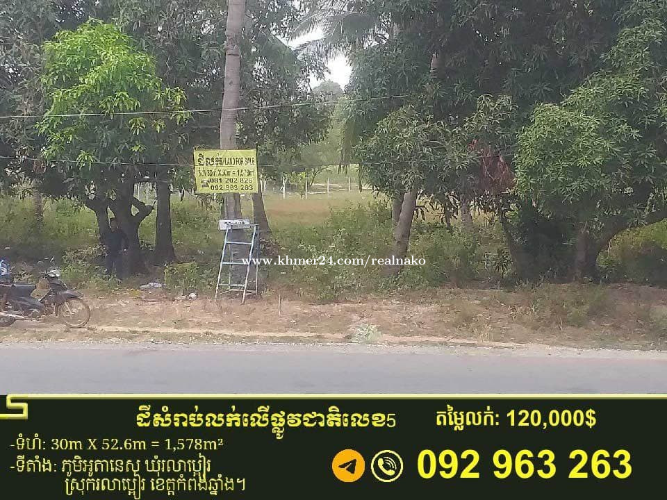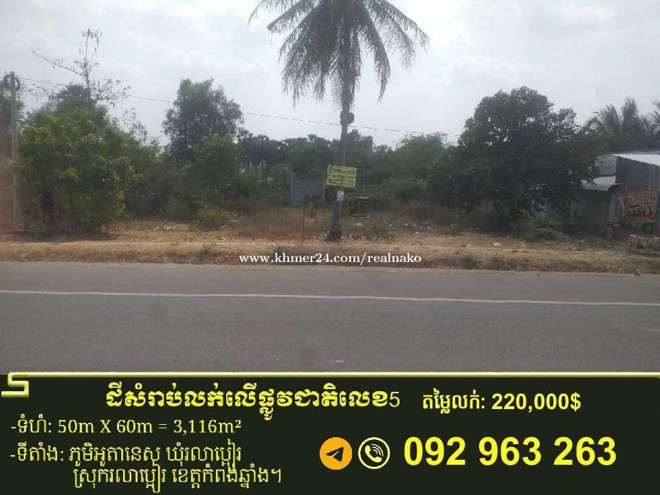 👀ដីលក់ប្រញាប់លុយ ជាប់ផ្លូវជាតិលេខ៥ នៅទីប្រជុំជន ជិតស្នាក់ការគយថ្មី ជិតផ្សារព្រៃខ្មែរ ជិតភោជនីយ៏ដ្ឋាន......... ៖ ✅ទំហំ ៖ 50mX60m(ប្លង់រឹង) ✅តម្លៃពីមុន៖ 358,000$ ឥលូវលក់តែ 220,000$ (ដាច់) ✅សណ្ឋានដីស្មើ ដែលល្អប្រសើរសម្រាប់ធ្វើការ៉ាសឡាន ការ៉ាសសាំង...........។ ទីតាំង ៖ ភូមិអូរតាណេស ឃុំរលាប្អៀរ ស្រុក រលាប្អៀរ ខេត្តកំពង់ឆ្នាំង។ https://maps.app.goo.gl/SyHacQuYEfgms2bT9 ......................................................................................................................... -ដីទីតាំងទី2៖ ✅ទំហំ ៖ (30mX52.6m)1578m2(ប្លង់រឹង) ✅តម្លៃពីមុន៖ 180,000$ ឥលូវលក់តែ 110,000$ (ដាច់) ✅សណ្ឋានដីស្មើ ដែលល្អប្រសើរសម្រាប់ធ្វើការ៉ាសឡាន ការ៉ាសសាំង...........។ ទីតាំង ៖ ភូមិអូរតាណេស ឃុំរលាប្អៀរ ស្រុក រលាប្អៀរ ខេត្តកំពង់ឆ្នាំង។ https://maps.app.goo.gl/sQ6EC1rNamZR6BYs9 ☎️ 092963xxxClick To Call (telegram )