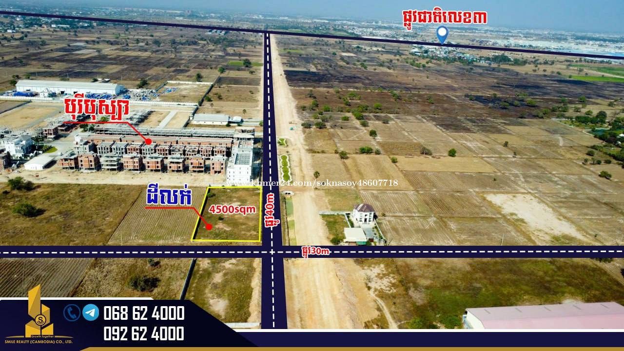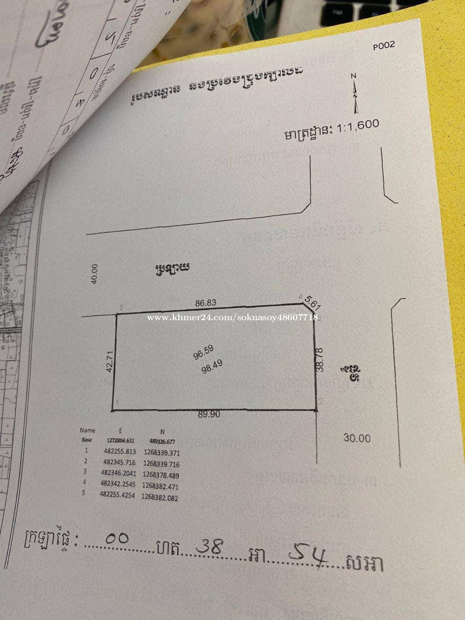 ដីស្អាត ជាប្រភេទដីសង់ផ្ទះសបហៅ ចាក់បំពេញ និងធ្វើរបងថ្មរួច ស្ថិតលើផ្លូវបេតុងរដ្ឋធំទូលាយប្រឡាយ៤០មមិនទាល់ ជាផ្លូវសេដ្ឋកិច្ចឆ្លងកាត់ផ្លូវព្រៃស ទៅផ្លូវលេខ៣ ហើយកែងផ្លូវរដ្ឋ១២ម ទំហំដី 90ឞ x ៤០ឞ ជាប់បុរីបុស្បា តម្លៃពិសេស