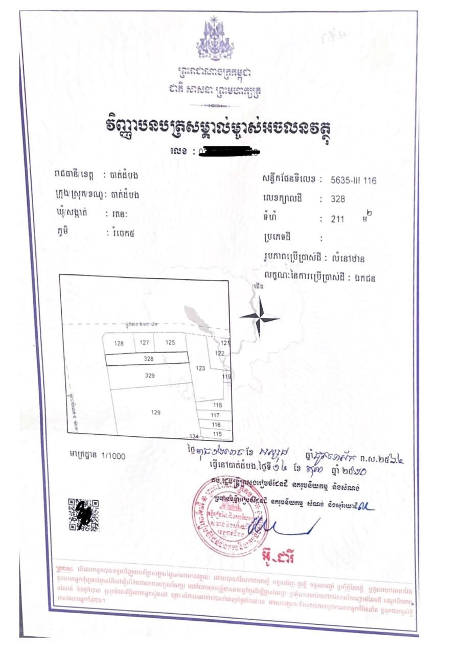 ប្រភេទ : ដីលក់ ទហំ : 211ម៉ែតការ៉េ 👉🏻 ទំហំ 5មx41ម 👉🏻 តម្លៃ $422,000 ចរចារបាន 👉🏻 ប្លង់រឹង កាត់ប្លង់ជូន 👉🏻 ទីតាំង ភូមរំចេក5 ឃុំរតនះ ស្រុកបាត់ដំបង ខេត្តបាត់ដំបង ជាប់មាត់ផ្លូវជាតិលេខ 5 ព័ត៍មានទំនាក់ទំនង: សូមបញ្ជាក់ប្រាប់ថា អ្នកបានឃើញកាតផ្សព្វផ្សាយនេះនៅលើ khmer24 📞 093787xxxClick To Call