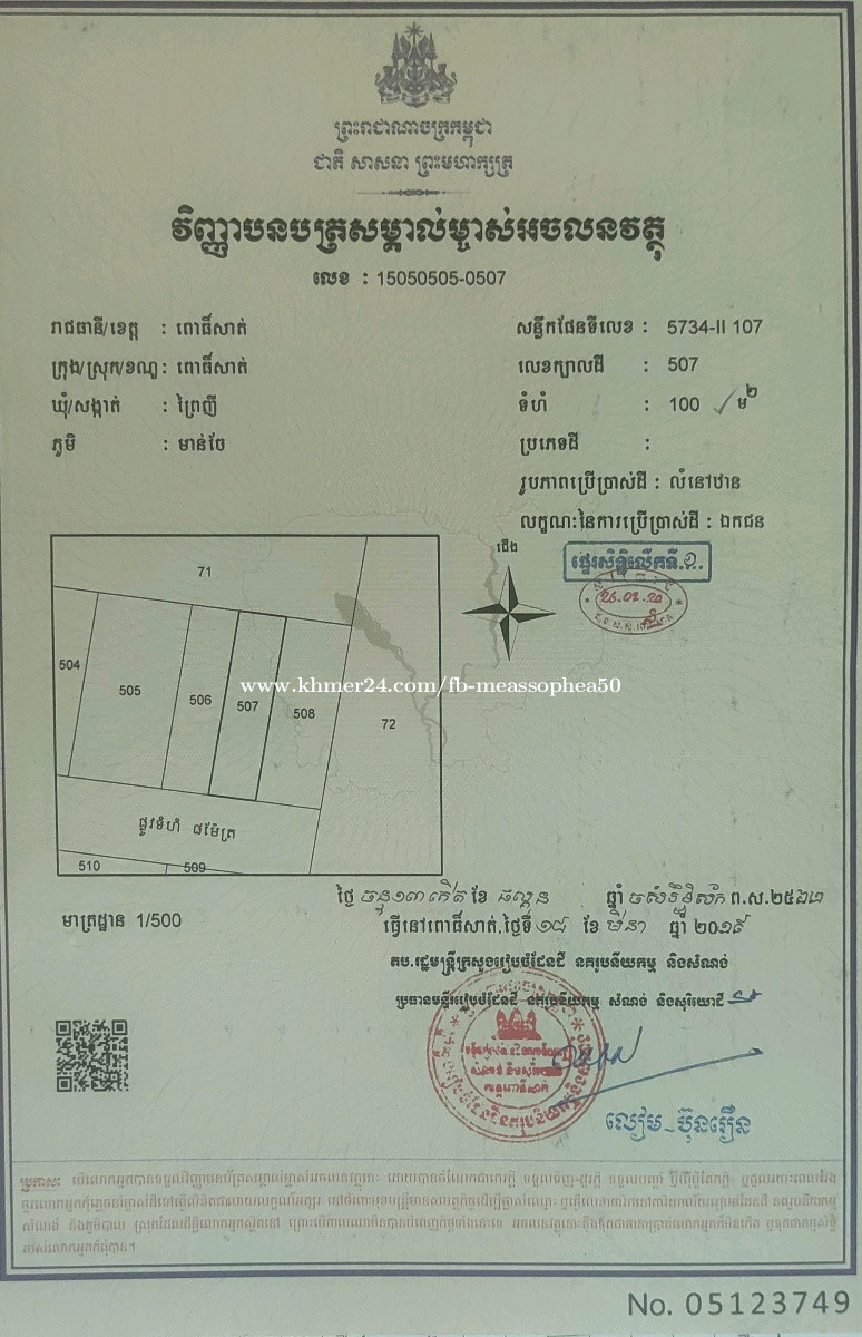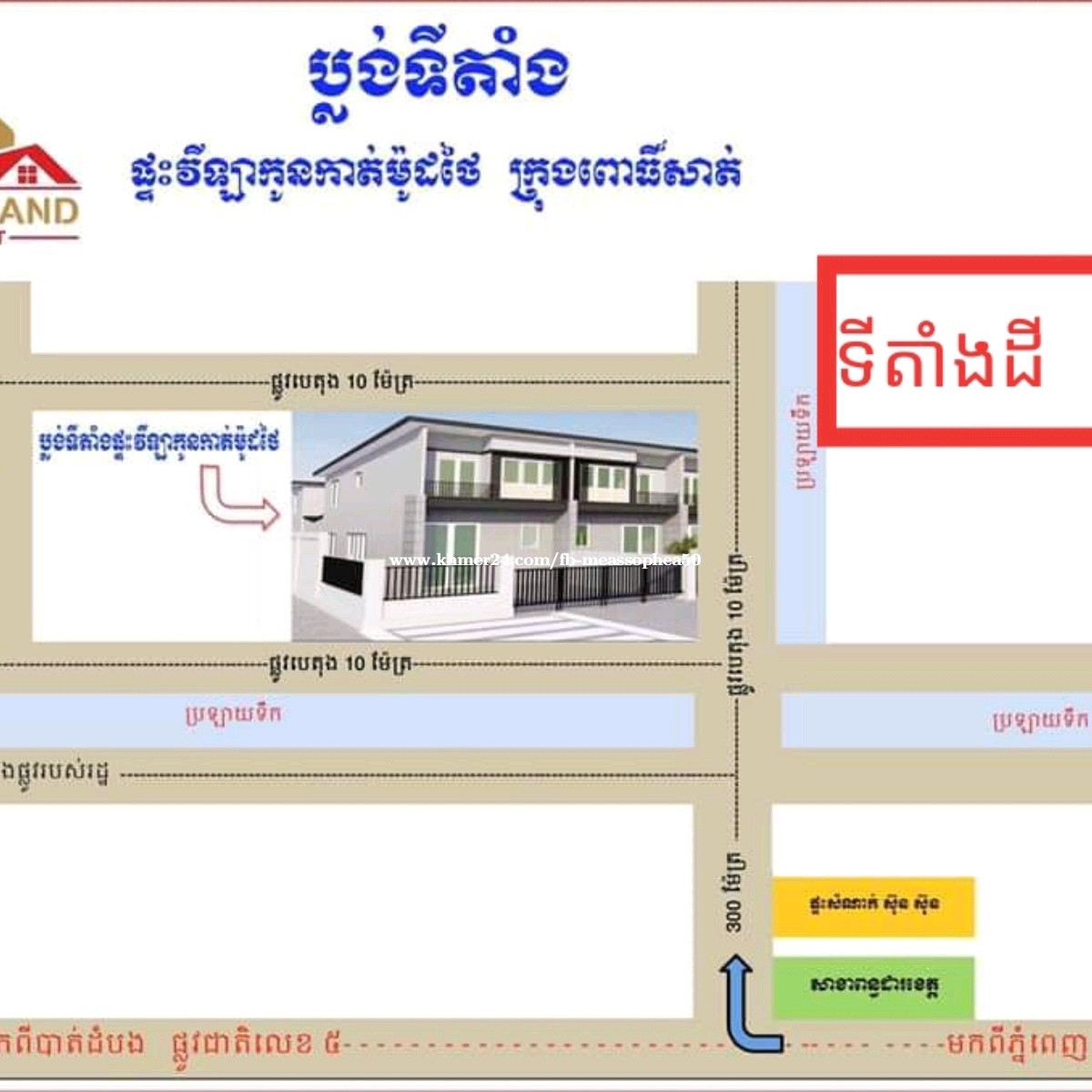ដីក្រុងពោធិ៍សាត់ ជាប់និងដីឡូតិ៍និងបុរីដឺសាន់ វិឡាកូនកាត់បែបថៃ សិត្ថនៅភូមិមាន់ចែ ឃុំព្រៃញី ក្រុងពោធិ៍សាត់ ខេត្ត ពោធិ៍សាត់ ចូលតាមច្រកពន្ធដា ខេត្តចម្ងាយប្រហែល500m ដីចំកណ្តាលក្រុ ជាដីប្លង់រឹង